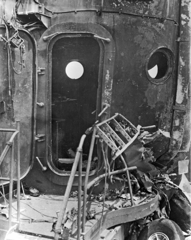 146k | USS LCS(L)(3)-122 was on Radar Picket Station #15A when she was hit by a Val Kamikaze plane, 11 June 1945. The wheel of the Val kamikaze