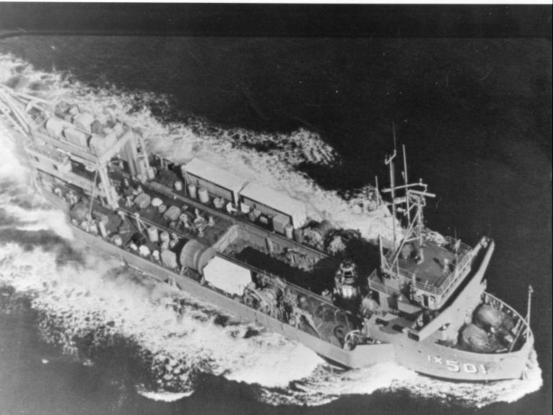 77k | Overhead view of Elk River (IX-501) underway, off Long Beach, CA., in November 1967 in support of the SEALAB III Project. Note the command and medical vans on her main deck. US Navy photo # NH 43550 from the collections of the US Naval Historical Center. |