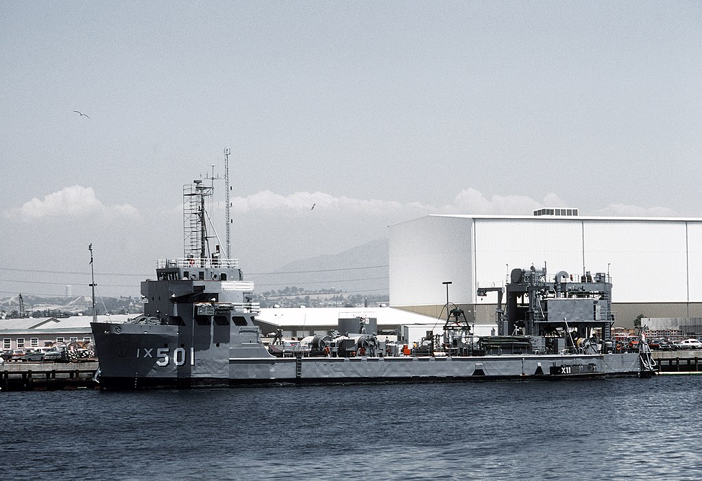186k | USS Elk River (IX-501) moored pierside, 1 July 1982, while serving as Deep Submergence Support Ship, location unknown.