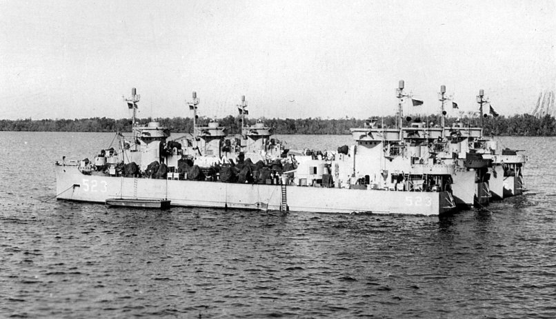USS LSM(R)-523, USS LSM(R)-524, USS LSM(R)-525, USS LSM(R)-527, USS LSM(R)-526 and USS LSM(R)-519 at anchor in a nest of six LSMRs at Green Cove Springs, FL, January 1946. The deck log entry of LSM(R)-524 for January 1946 indicates the following: "Moored at Berth Oak 31, St. John's River, Green Cove Springs, Fla. in 14 feet of water, mud bottom, with 35 fathoms of chain to bow anchor, 300 feet of cable to the stern anchor and moored port side to the USS LSM(R) 523 moored to the starboard side, the starboard side to the USS LSM (R) 525 moored to the port, port side to, USS LSM (R) 527 moored to the USS LSM (R) 525, USS LSM (R) 526 moored to LSM (R) 527, USS LSM (R) 519 moored to starboard side of USS LSM (R) 526 on the following Bridge bearing 166 (T), North End of bridge 068 (T), tower 219 (T) with the following machinery in operation #1 ship service generator, #1 boiler, #2 refrigerator, #2 fresh water pump, #2 fire and flushing pump, #2 air compressor" |
