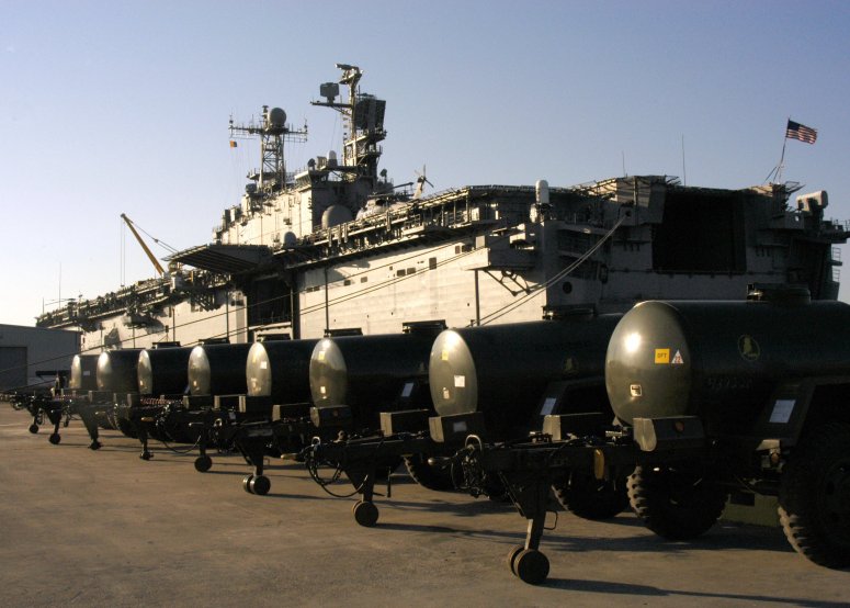 75k | USS Saipan (LHA-2) moored pierside at Pascagoula, MS., 25 January 2005. Eight 400 gallon water tanks are lined up in preparation to be loaded aboard the ship. Saipan is/was on a scheduled two-month deployment to the U.S. Southern Command (NAVSO) area of responsibility in support of New Horizons, the humanitarian assistance efforts in Haiti. US Navy photo # 050125-N-0050M-003 by PH1 Kimberly E. McDonald, from the US Navy NewsStand web site. |