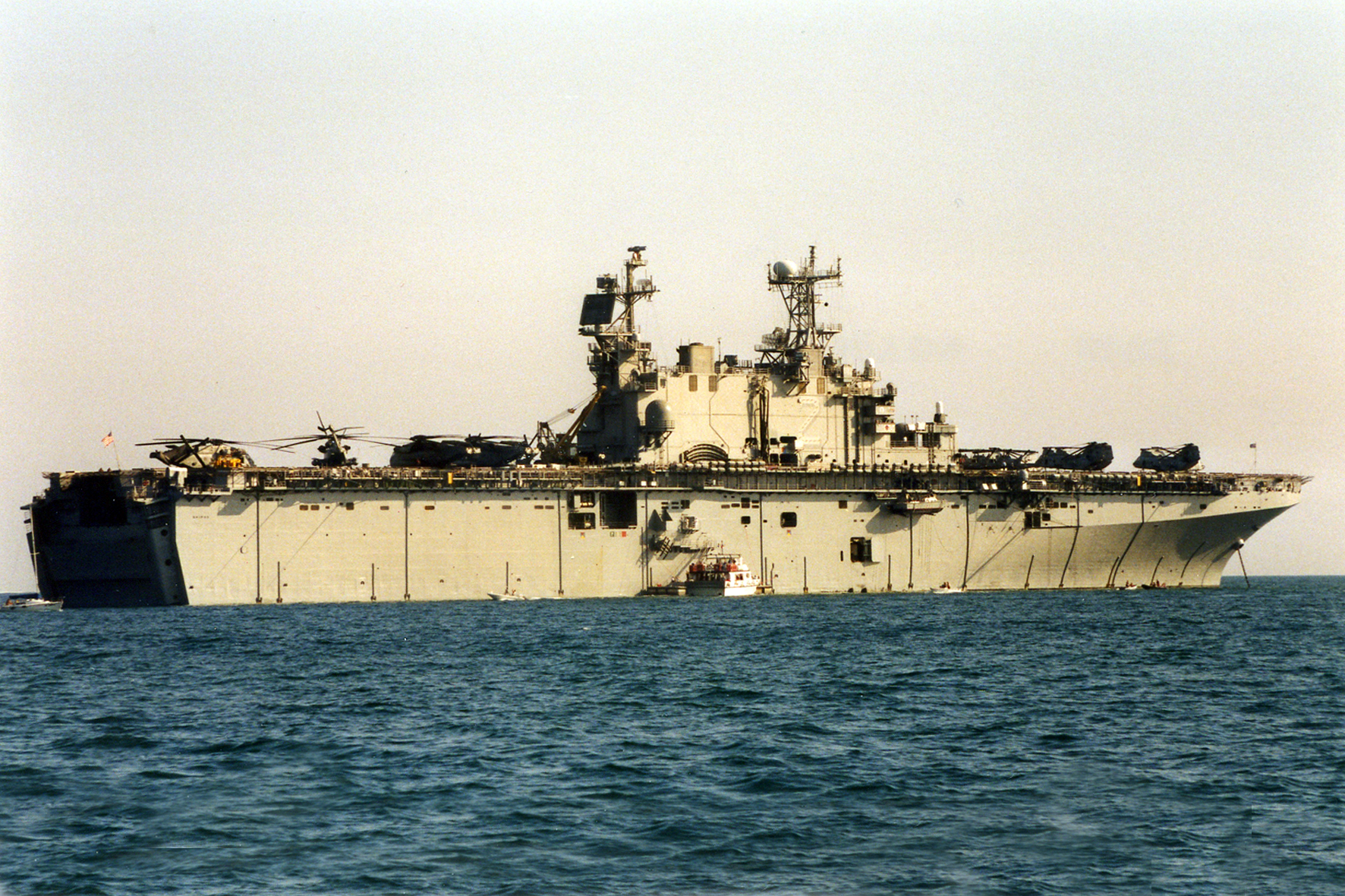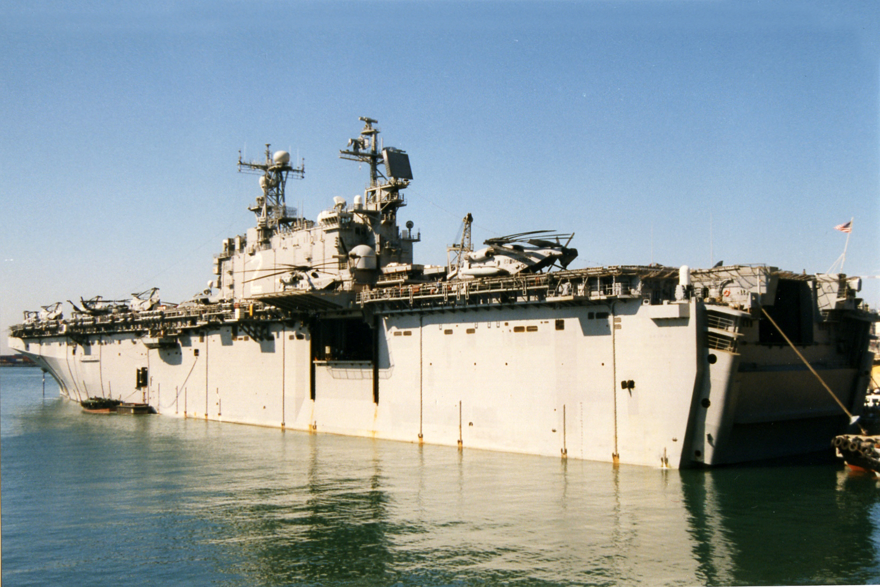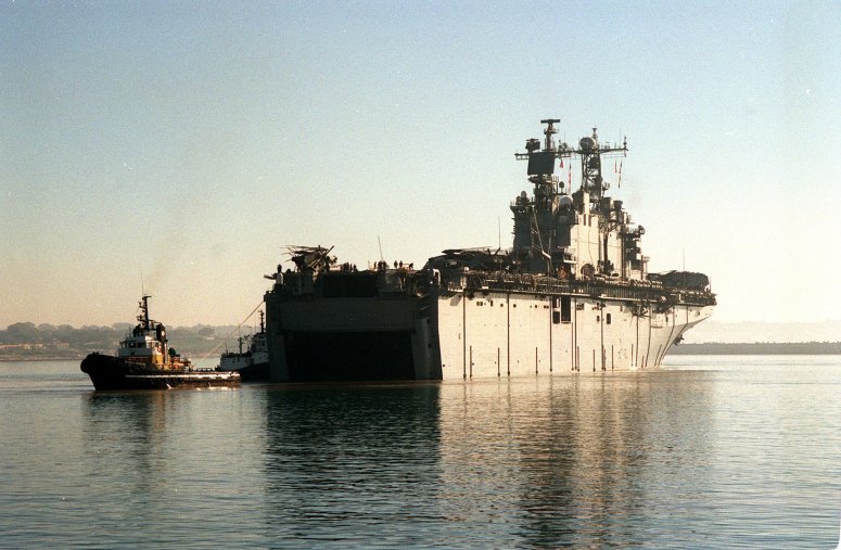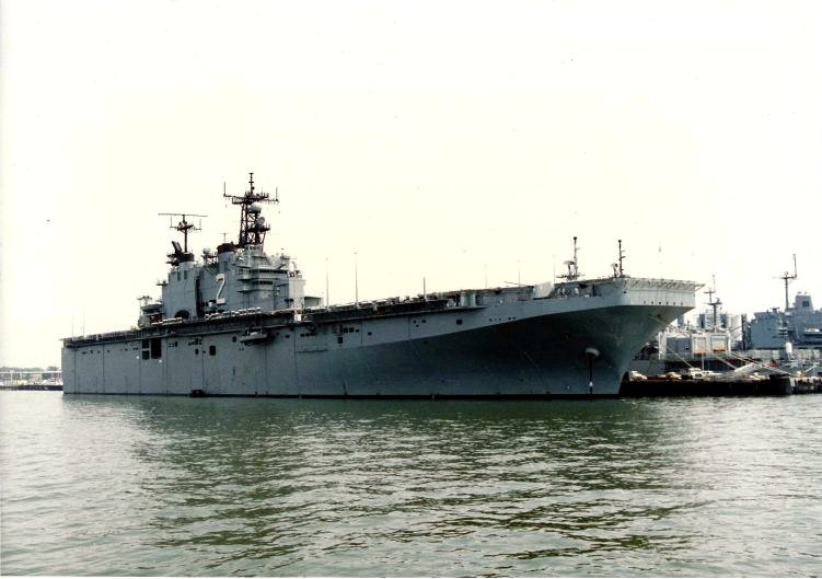 58k | USS Saipan (LHA-2) with stern gate down and ballasted, NOB Norfolk, VA., summer 1992. | Photo by Adam Robison | |