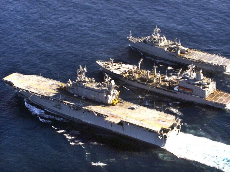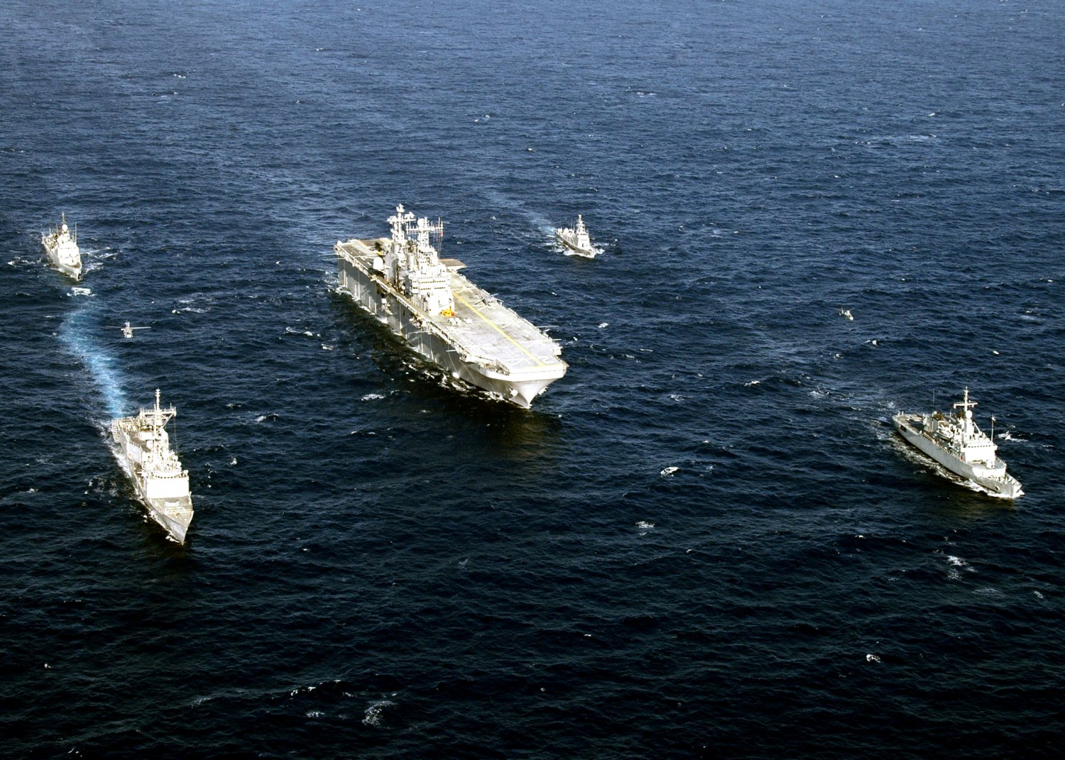 373k | The amphibious assault ships of Commander, Task Force Fifty One (CTF-51) come together in an unprecedented formation during operations in the North Arabian Gulf. This marked the first time that six large deck amphibious ships from the East and West coasts have deployed together in one area of operation. Led by the flag ship USS Tarawa (LHA-1), the ships are (from left to right): USS Bonhomme Richard (LHD-6), USS Kearsarge (LHD-3), USS Bataan (LHD-5), USS Saipan (LHA-2), and USS Boxer (LHD-4). CTF-51 led Navy amphibious forces in the Arabian Gulf region during Operation Iraqi Freedom. The 32 ships of CTF-51 composed the largest amphibious force assembled since the Inchon landing, during the Korean War. Operation Iraqi Freedom is the multinational coalition effort to liberate the Iraqi people and end the regime of Saddam Hussein. US Navy photo # 030420-N-2515C-091 North Arabian Gulf (Apr. 20, 2003) by PH2 Larry S. Carlson. US Navy photo # 030420-N-7128D-011 North Arabian Gulf (Apr. 20, 2003) by PHC Tom Daily. |