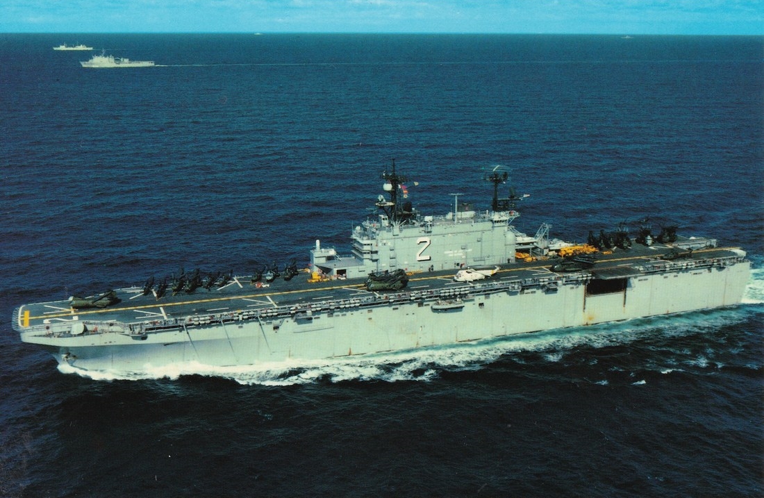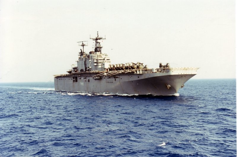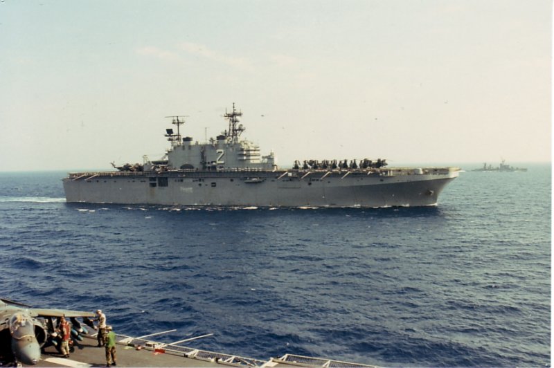 78k | USS Saipan (LHA-2) underway off Italy during NATO Exercise "Dragon Hammer", in May 1990. Photos taken from the Spanish carrier Príncipe de Asturias (R-11) | Photo by Omar Rubido, Armada Española | |