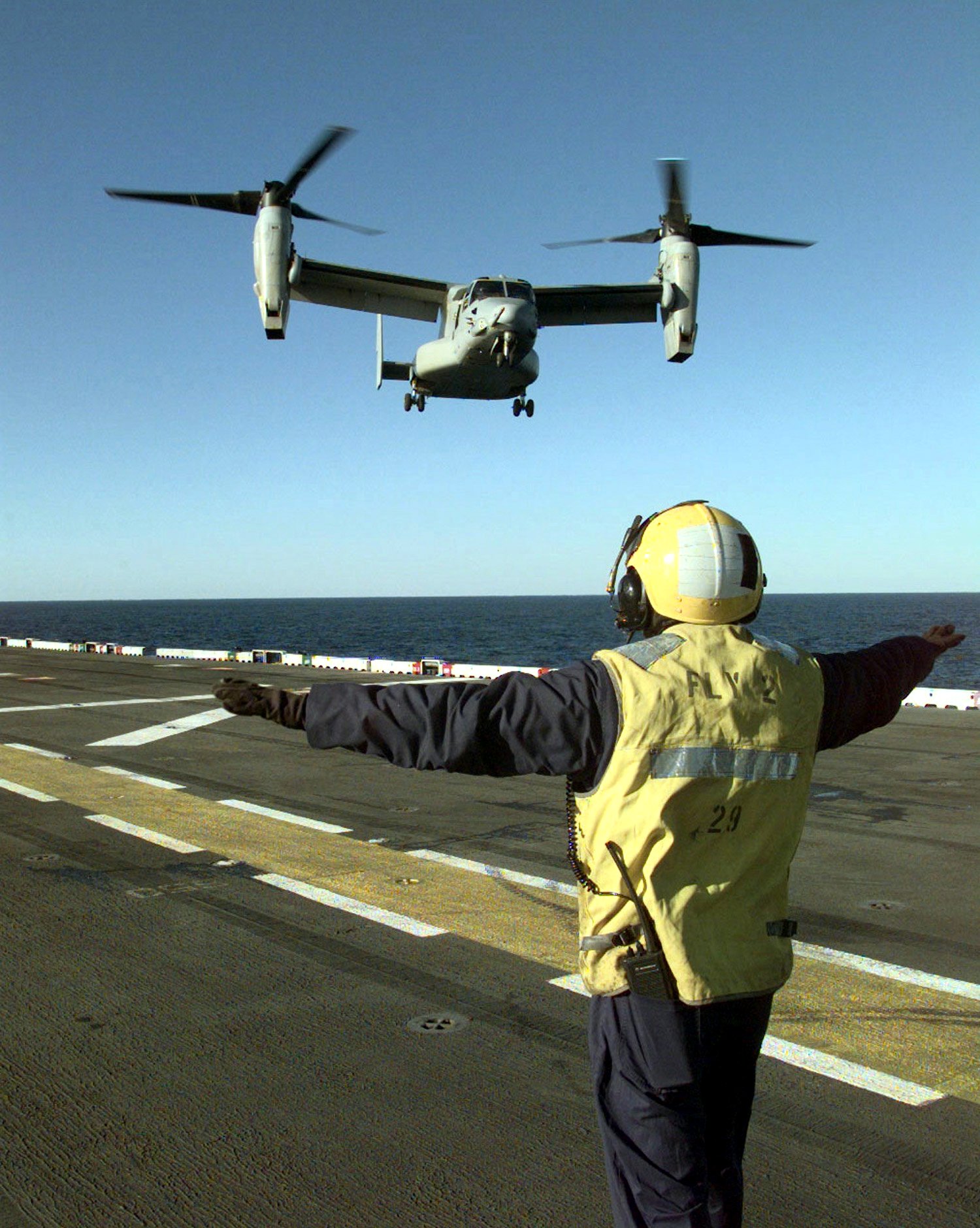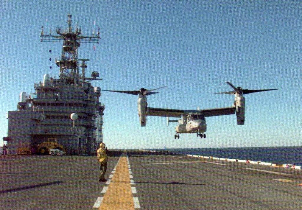 450k | An MV-22B "Osprey" makes its landing approach to the flight deck of USS Saipan (LHA-2) during deck landing qualifications, 17 January 1999. The Osprey is conducting aircraft shipboard developmental tests on board Saipan and represents their first launchings and recoveries aboard an LHA. US Navy photo # 990116-N-4004O-503 ABOARD USS SAIPAN (January 17, 1999) by PH1 Benjamin D. Olvey. |