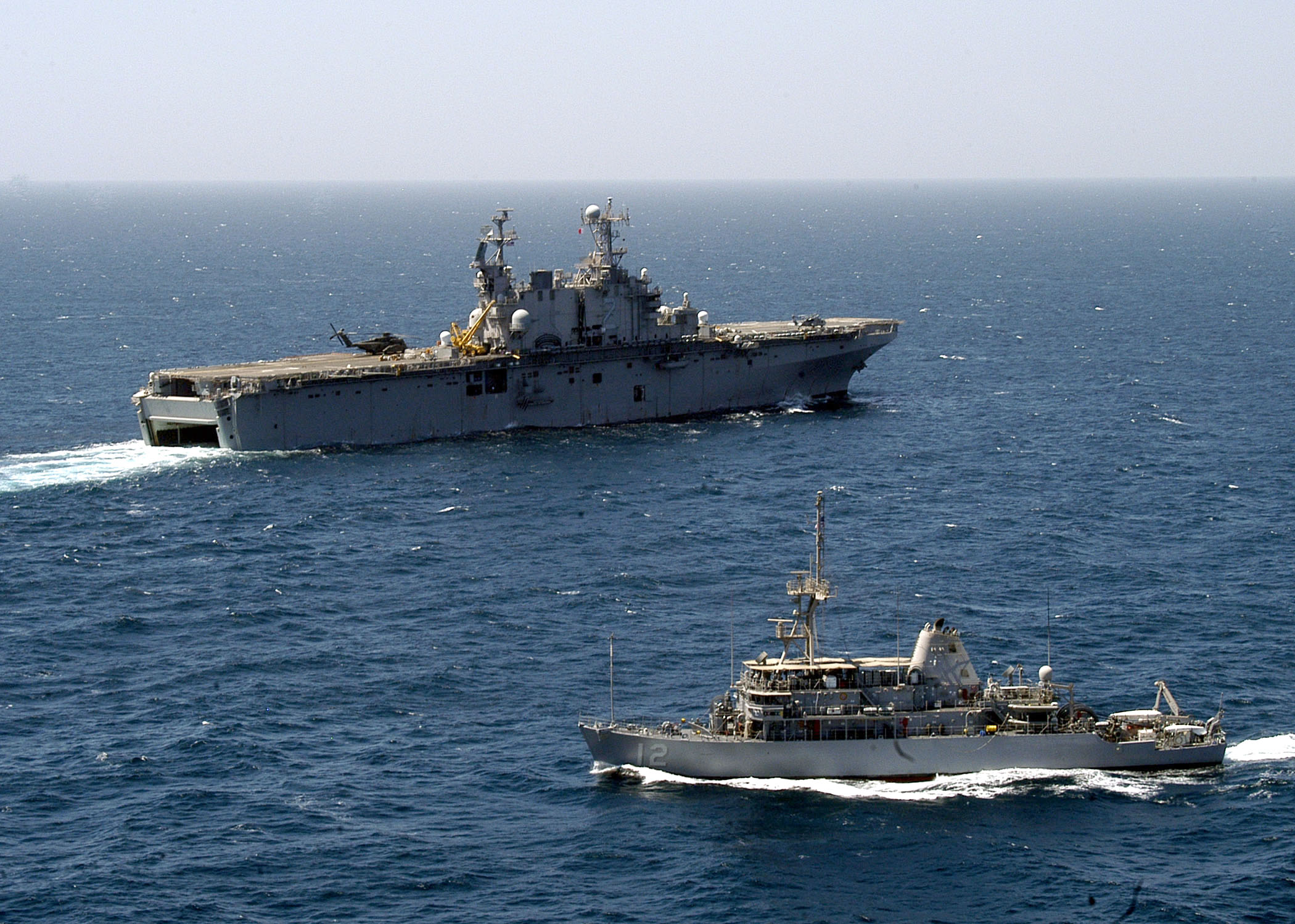 566k | USS Saipan (LHA 2) and mine countermeasure ship USS Ardent (MCM-12) conduct mine sweeping operations in the Persian gulf. Saipan was deployed conducting maritime security operations (MSO) in support of the global war on terrorism. US Navy photo # 060919-N-2651J-022 Persian Gulf (Sept. 19, 2006) by MC3 Gary L. Johnson III. |