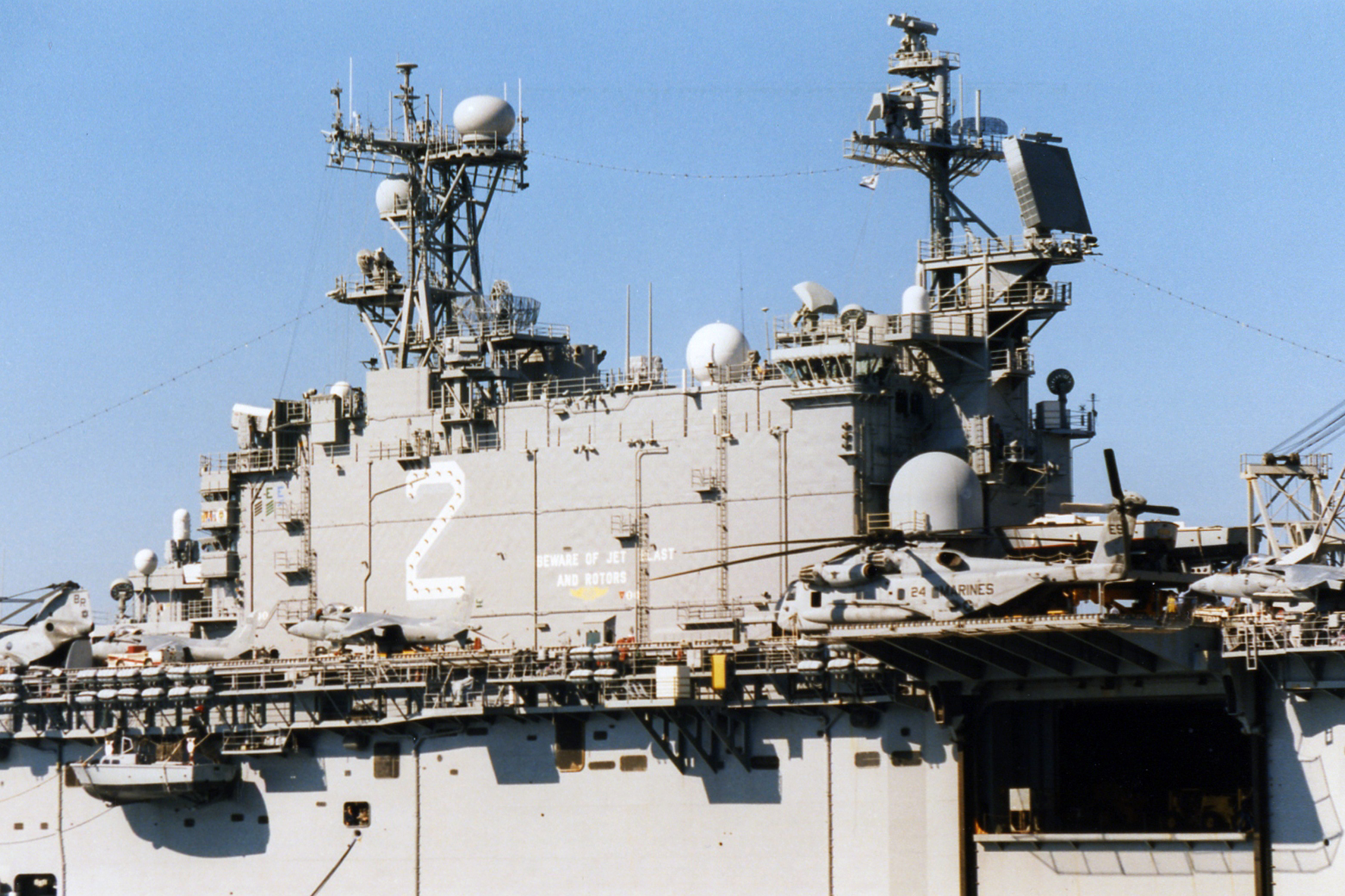 92k | USS Saipan (LHA-2) at Barcelona, Spain, 2 January 1982, during her second Med deployment. Note 5" gun on port bow and BPDMS launcher, forward of the island structure and beyond the Sea Stallion's tail rotor. Both were part of the ships original configuration and were later removed. | Photo by Fabio Peña | |