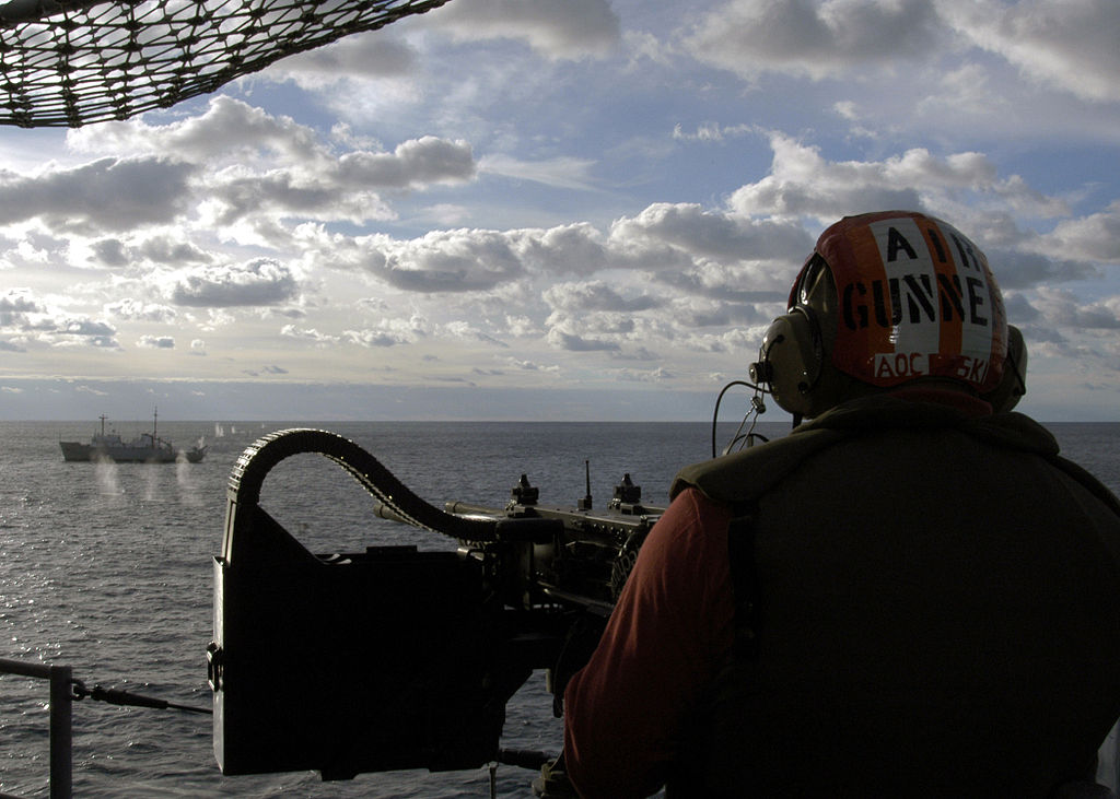 120k | AOC Scott Kuczynski, fires a twin .50-caliber machine gun aboard USS Saipan (LHA-2) at the decommissioned