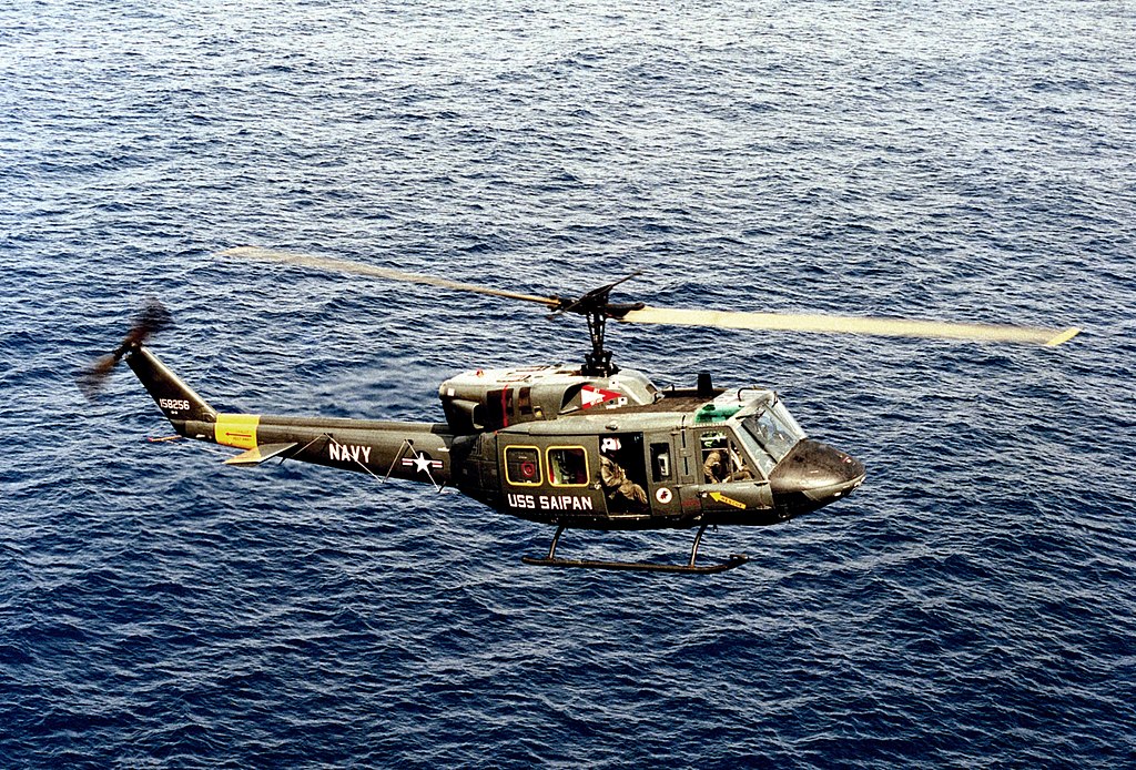 361k | A U.S. Navy Bell UH-1N Iroquois (BuNo 158256) "Twin Huey" helicopter assigned to USS Saipan (LHA-2) in flight during the NATO Southern Region