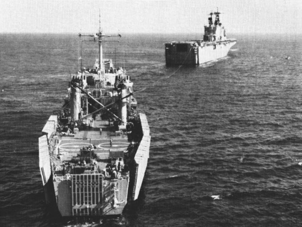 133k | USS Saipan (LHA-2) (background) towing USS Barnstable County (LST-1197) through the waters off the Virginia Capes during a towing exercise, circa 1981.