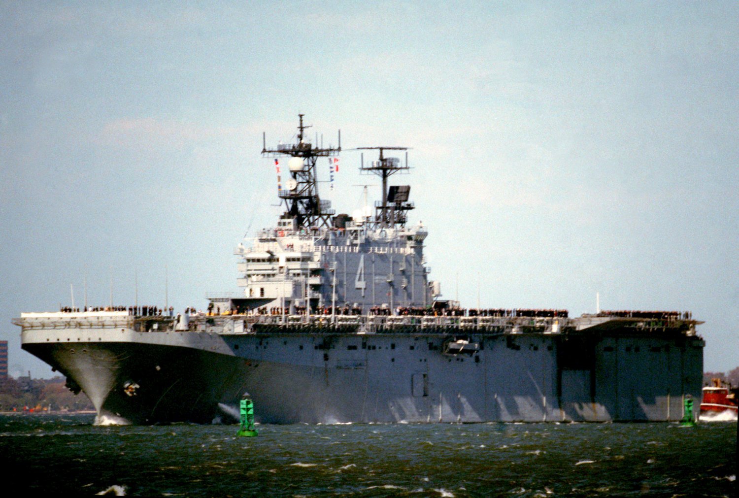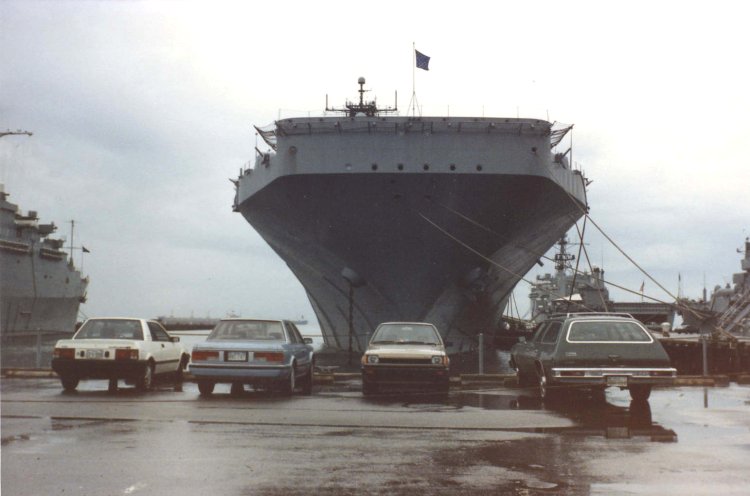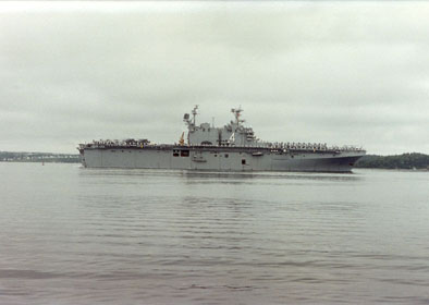 43k | USS Nassau (LHA-4), preparing to moor at Norfolk Naval Station, summer 1992. | Photo by Adam Robison | |