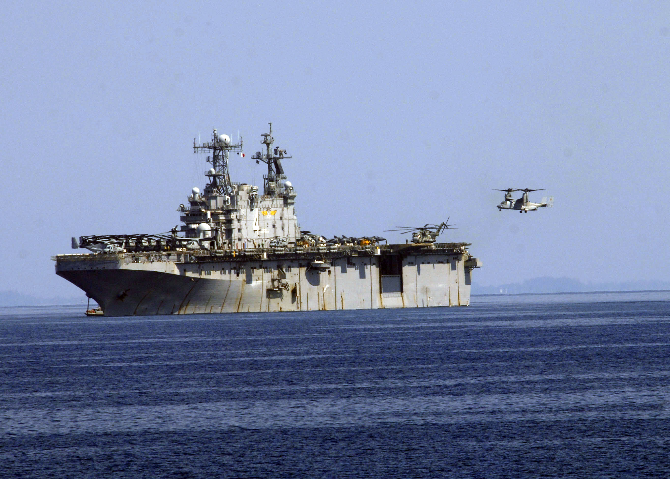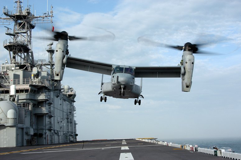 601k | A V-22 Osprey prepares to land aboard USS Nassau (LHA-4) off the coast of Haiti. Nassau is conducting humanitarian and disaster relief operations as part of Operation Unified Response after a 7.0 magnitude earthquake caused severe damage in and around Port-au-Prince, Haiti, Jan. 12. US Navy photo # 100208-N-7638K-018 NEPLY, Haiti (Feb. 8, 2010) by MC1 Edward Kessler. |
