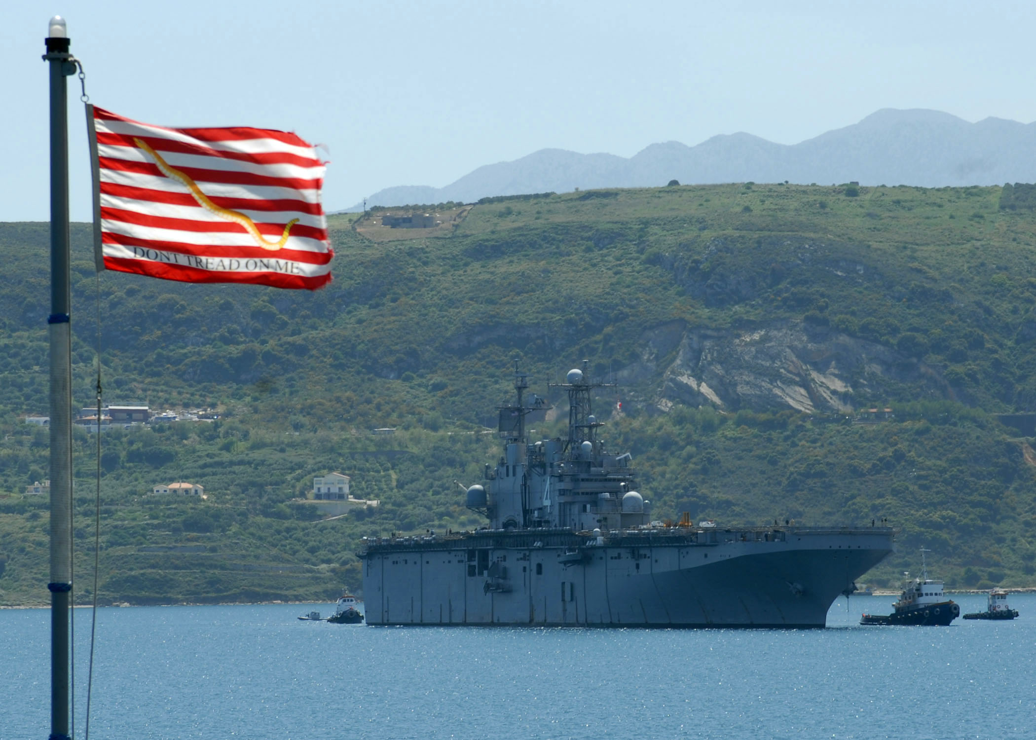 407k | The "Don't Tread on Me" jack waves from the forecastle of the frigate USS John L. Hall (FFG-32) as the amphibious assault ship USS Nassau (LHA-4) pulls into Souda Bay. Both ships are participating in Phoenix Express 2008 (PE 08), the third in a series of annual exercises to improve regional cooperation and maritime security by increasing interoperability by developing individual and collective maritime proficiencies of the participating nations, as well as promoting friendship, mutual understanding and cooperation. US Navy photo # 080408-N-2735T-030 SOUDA BAY, Crete (Apr. 8, 2008) by MC3 Coleman Thompson |