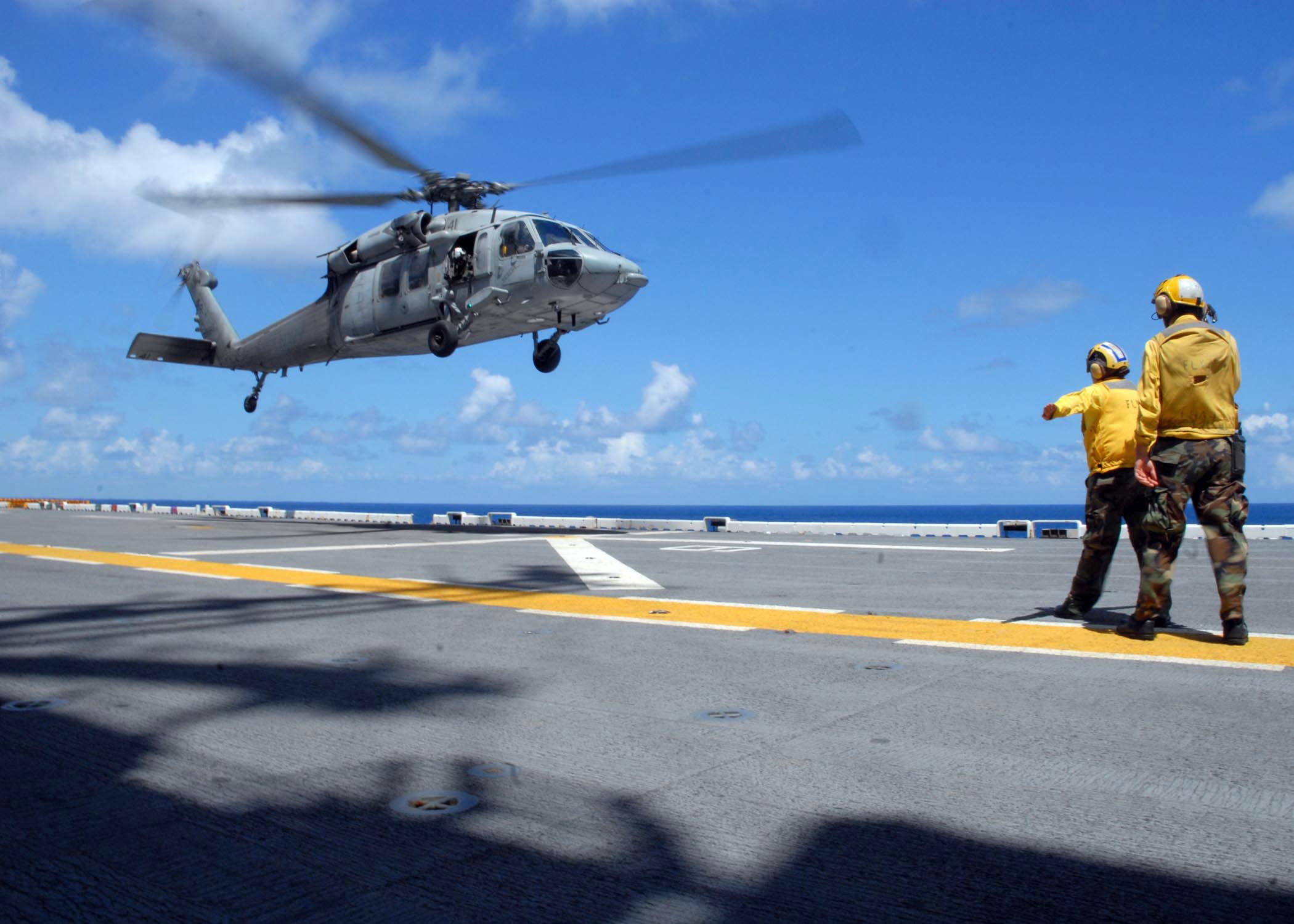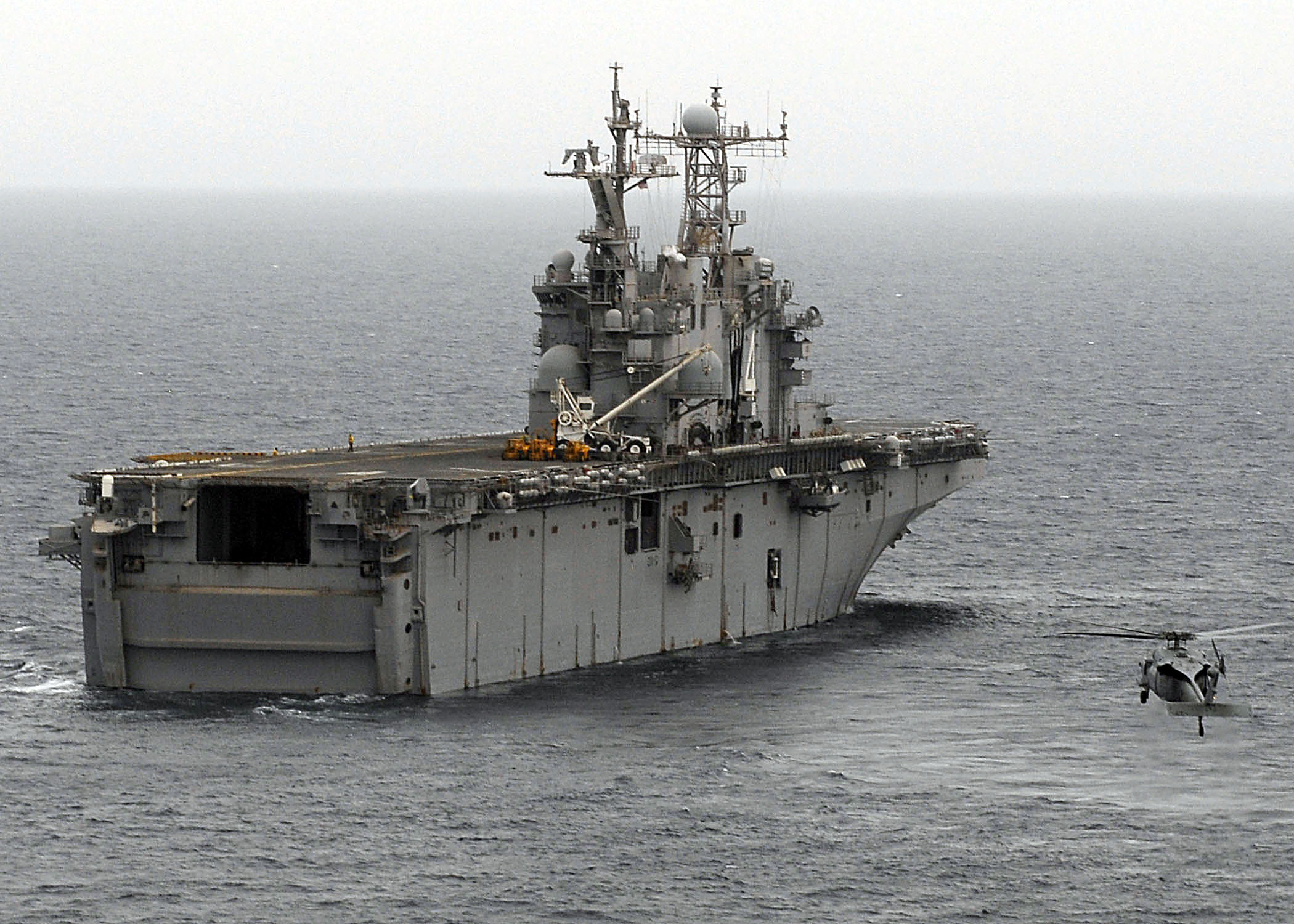 453k | An MH-60 Seahawk helicopter approaches USS Nassau (LHA-4), 12 May 2008. Nassau is one of six vessels in the