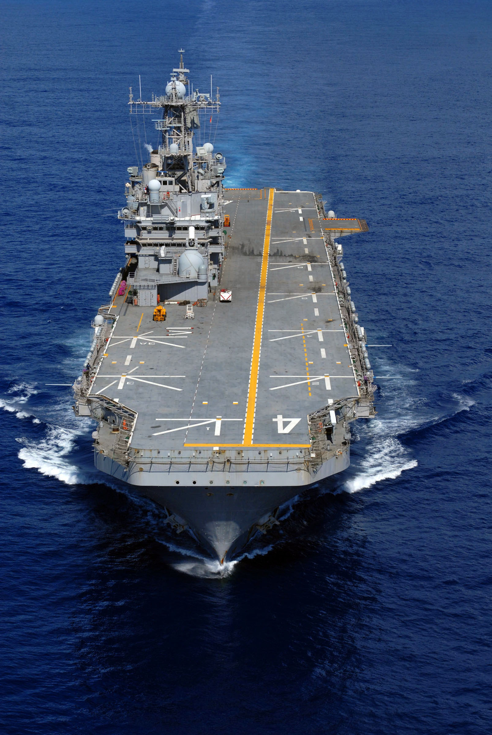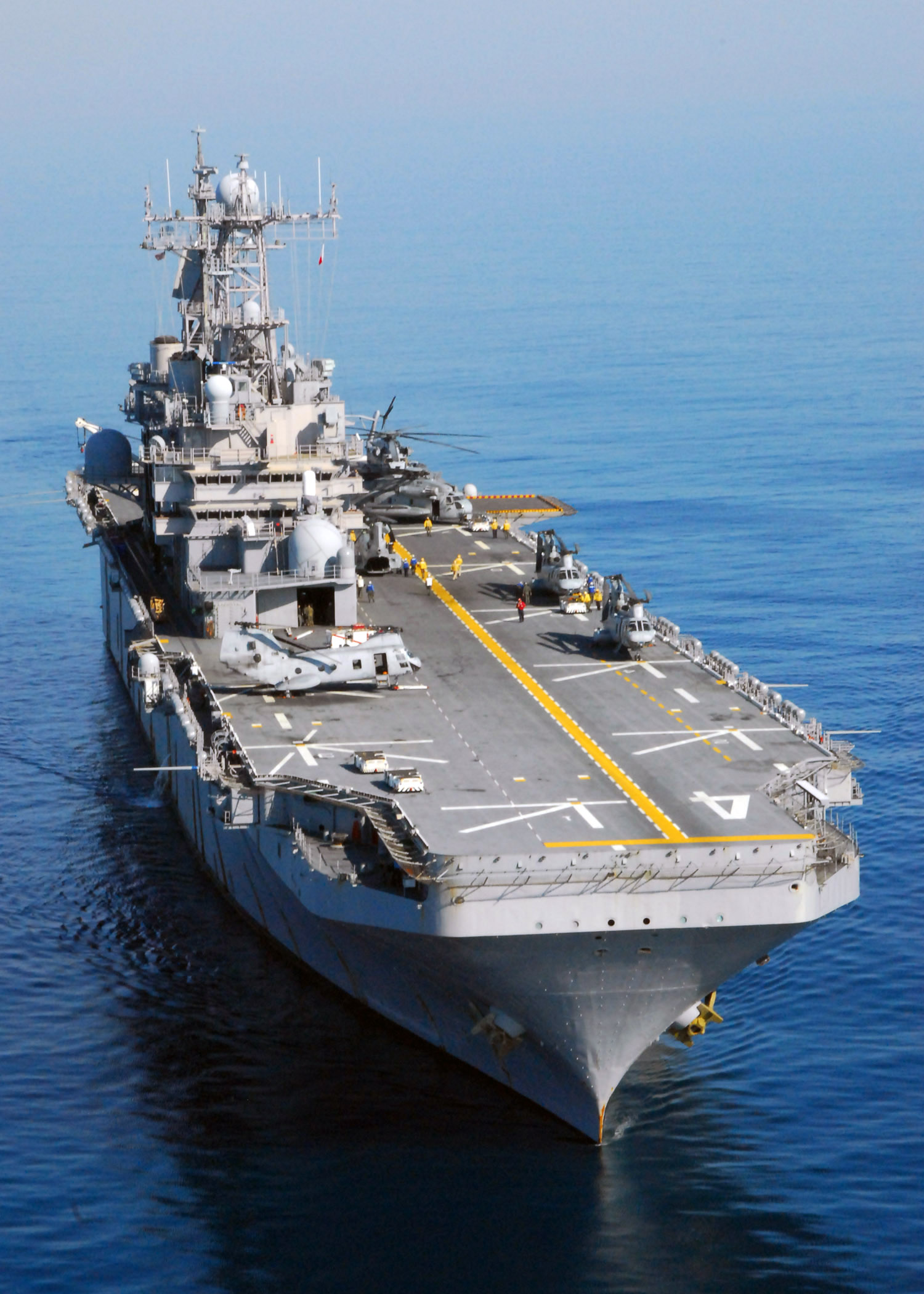 628k | Aerial bow view of USS Nassau (LHA-4) the flagship of the Nassau Expeditionary Strike Group, transits westward in the Atlantic Ocean, 5 July 2008. The Nassau Expeditionary Strike Group is completing its deployment to the US 5th and 6th Fleet areas of responsibility. US Navy photo # 080705-N-5712P-353 ATLANTIC OCEAN (July 5, 2008) by MCSN Jonathan Pankau. |