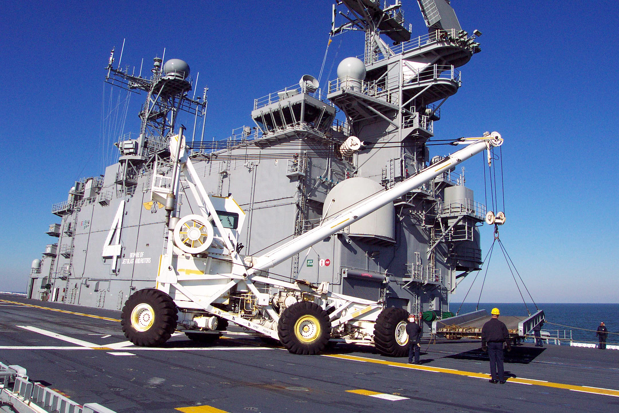 2159k | Members of USS Nassau (LHA-4)'s Air department Crash Crew maneuver an emergency heavy lift crane, nicknamed "Tilly" during a training exercise, 8 January 2002. Crash and Salvage crews often run drills simulating various kinds of accidents in order to improve their skill in firefighting and salvage operations. US Navy photo # 020108-N-9977R-002 UNDERWAY (8 January 2002) by PH1 Anibal Rivera. |