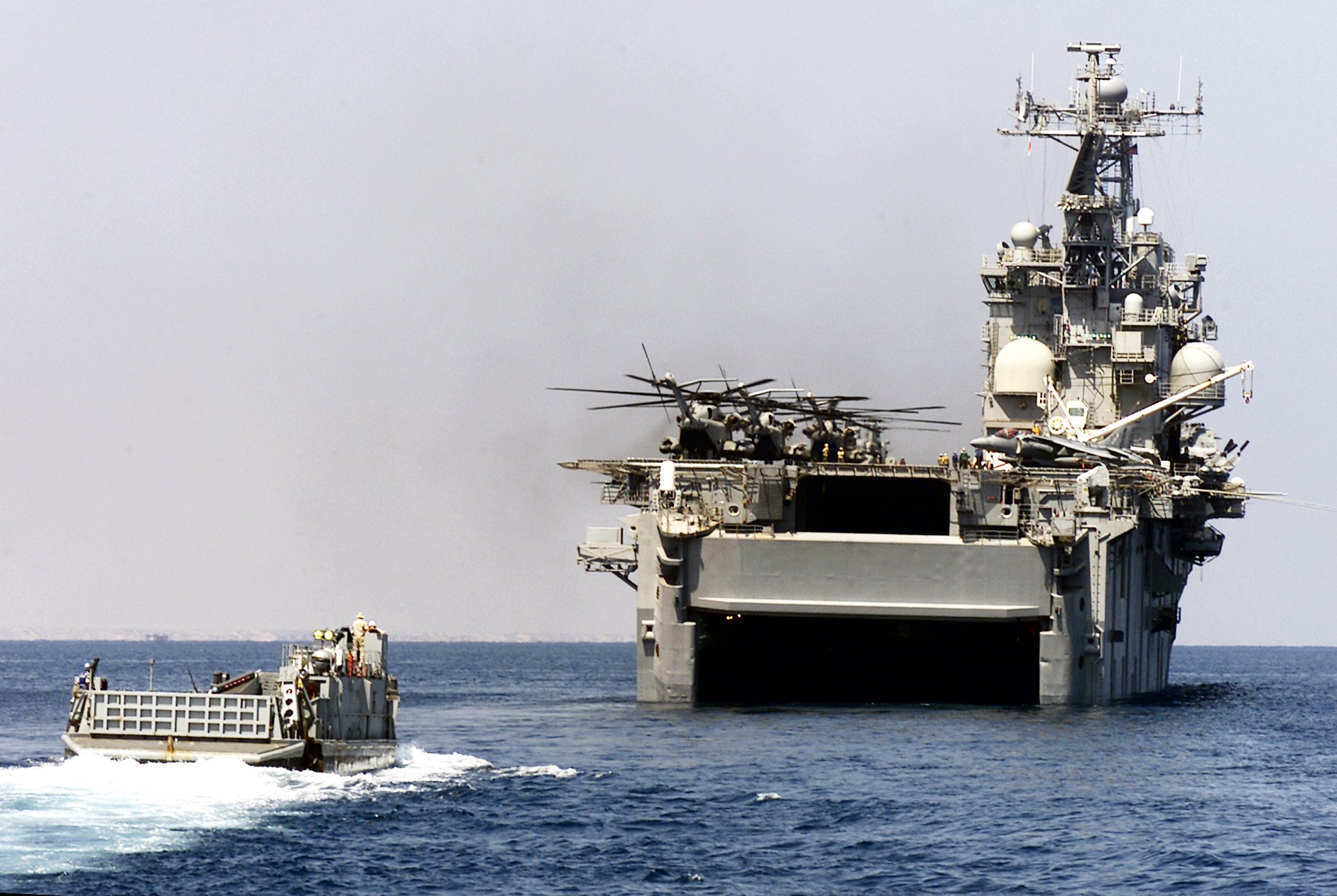 390k | US Navy Landing Craft Utility LCU-1664 approaches the well deck of USS Nassau (LHA-4), 10 November 2002. Nassau's embarked units are providing support and training for exercise “Image Nautilus” with the east African nation of Djibouti. U.S. Navy photo # 021110-N-9977R-002 Off the coast of Djibouti, Africa November 10, 2002 PH1 Anibal Rivera. |