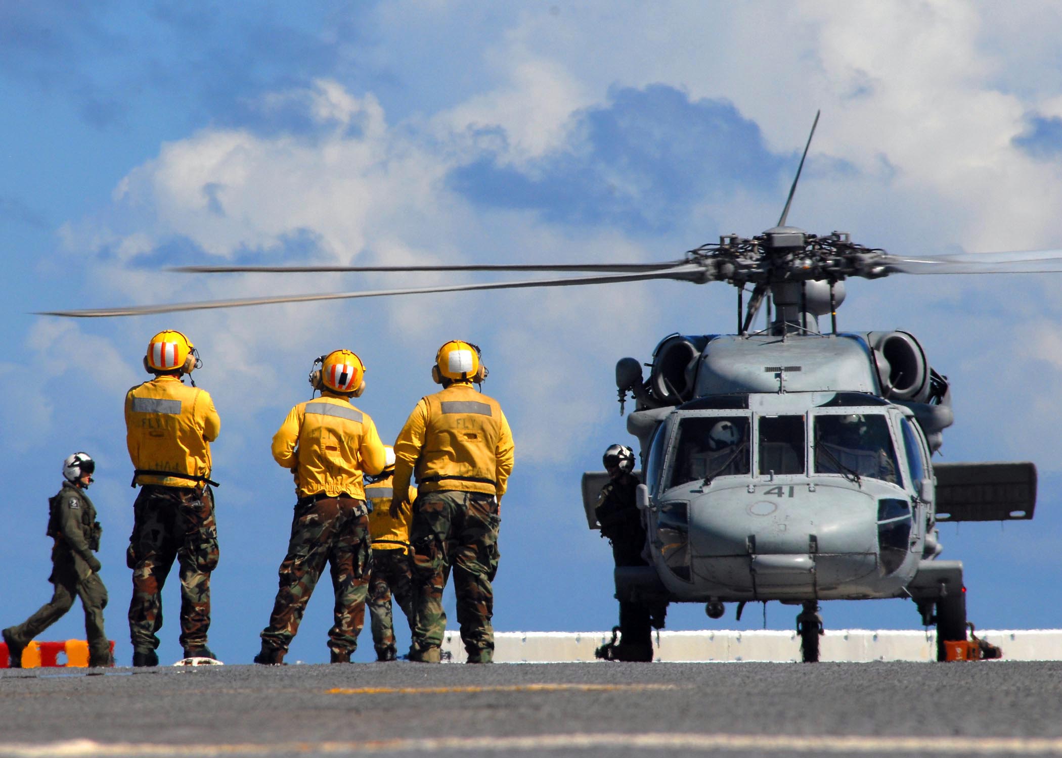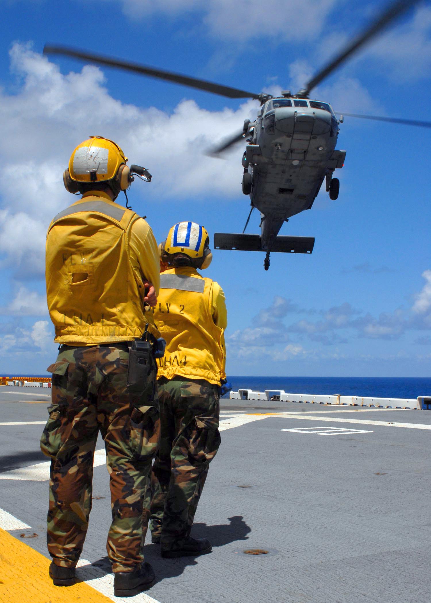 247k | Aviation Boatwain's Mates (Handling) direct the landing and launching of an MH-60S Sea Hawk helicopter assigned to