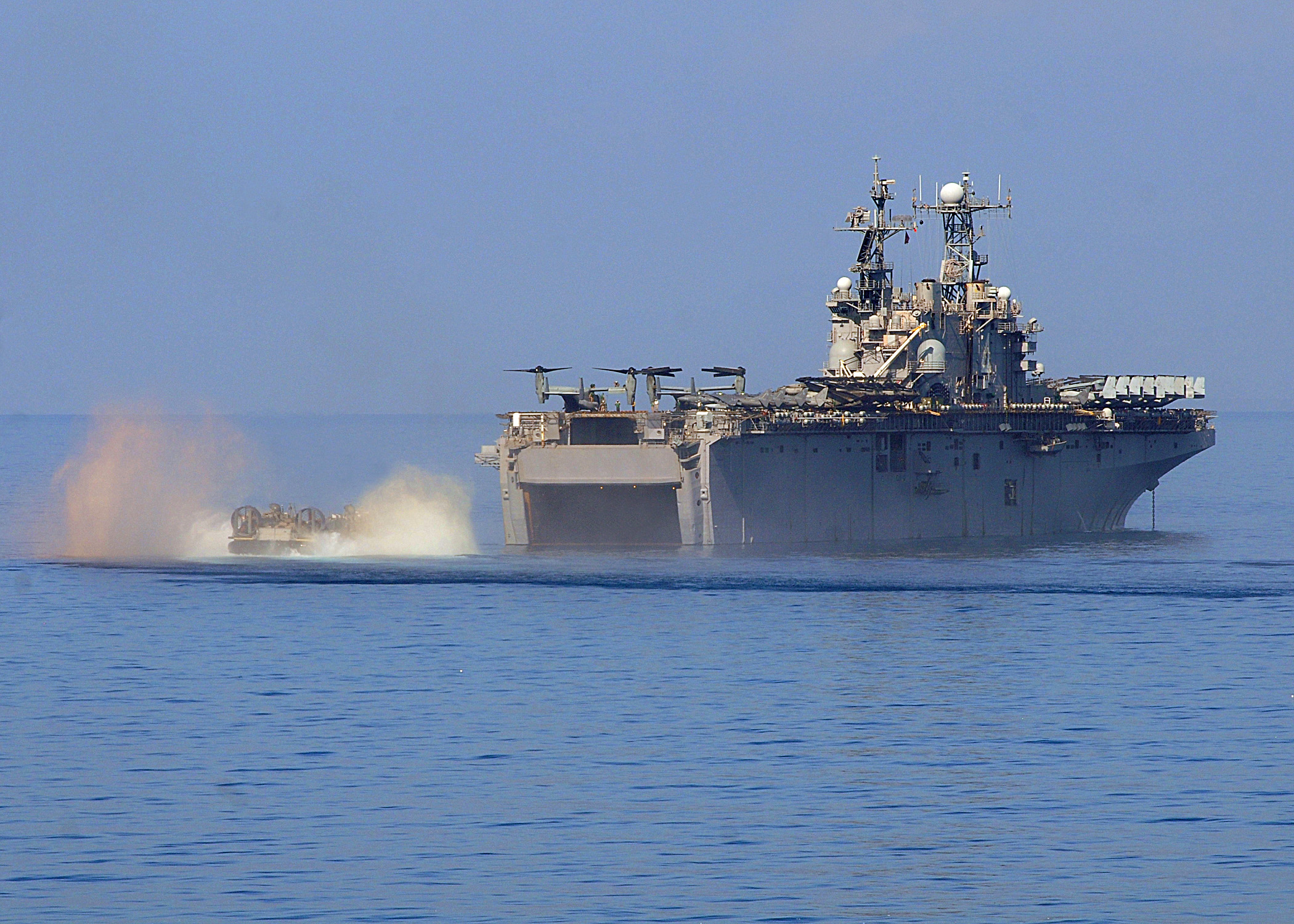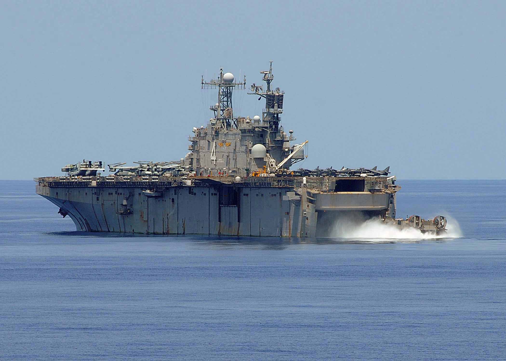 1068k | USS Nassau (LHA-4) prepares to receive a landing craft air cushion (LCAC). Nassau is conducting humanitarian and disaster relief operations as part of Operation Unified Response after a 7.0 magnitude earthquake caused severe damage in and around Port-au-Prince, Haiti Jan. 12. US Navy photo # 100208-N-1082Z-030 PORT-AU-PRINCE, Haiti (Feb. 8, 2010) by MC2 Jason R. Zalasky. |