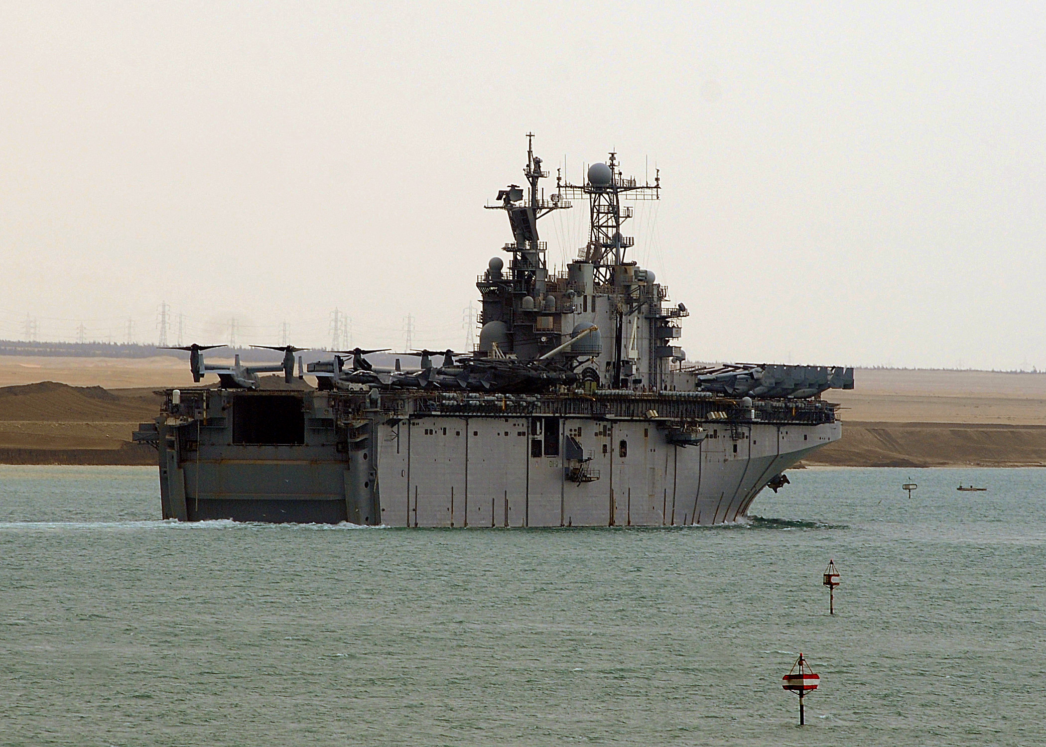 978k | USS Nassau (LHA-4) transits the Suez Canal. Nassau, the command platform for the Nassau Amphibious Ready Group, and Marines from the 24th Marine Expeditionary Unit (24th MEU) are on deployment as part of the Nassau Amphibious Ready Group supporting maritime security and theater security cooperation operations in the U.S. 5th Fleet area of responsibility. US Navy photo # 100226-N-1082Z-069 SUEZ CANAL (Feb. 26, 2010) by MC2 Jason R. Zalasky. |