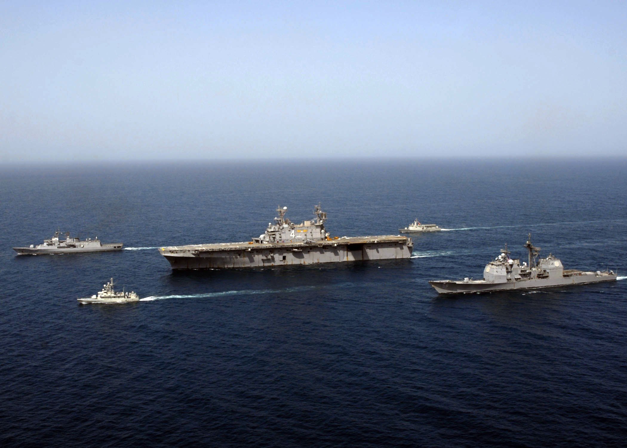 531k | The ships of the Nassau Strike Group (NASSG) transit westward in the Atlantic Ocean, 5 July 2008, as they wrap-up their deployment to the US 5th and 6th Fleet areas of responsibility. The Nassau Group is made up of the Norfolk, VA.-based amphibious assault ship USS Nassau (LHA-4); the amphibious transport dock ship USS Nashville (LPD-13); the amphibious dock landing ship USS Ashland (LSD-48); the guided-missile destroyers USS Ross (DDG-71) and USS Bulkeley (DDG-84); and the Mayport, FL.-based guided-missile cruiser USS Philippine Sea (CG-58). US Navy photo # 080705-N-2735T-887 ATLANTIC OCEAN (July 5, 2008) by MC3 Coleman Thompson. |