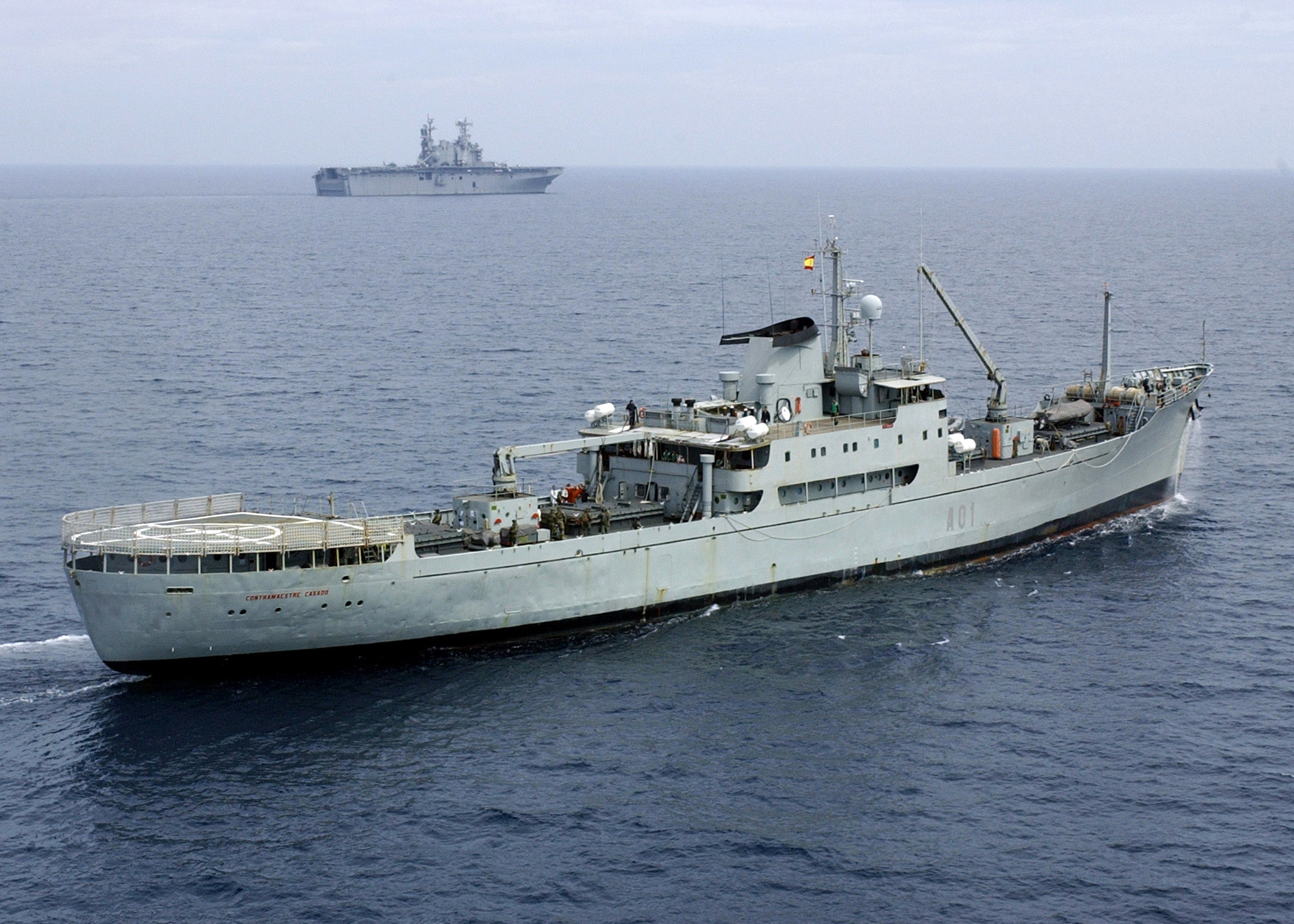 710k | Spanish transport ship SPS Contramaestre Casado (A-01) and the USS Nassau (LHA-4) conduct operations together in the Atlantic Ocean in support of exercise Phoenix Express, 18 April 2007. The two-week long exercise was designed to strengthen regional maritime partnerships, focused on developing increased maritime domain awareness, better information sharing practices and the ability to operate jointly. The exercise includes participants from Algeria, France, Greece, Italy, Malta, Morocco, Portugal, Spain, Tunisia, Turkey and the United States. US Navy photo # 070418-N-8493H-017 ATLANTIC OCEAN (April 18, 2007) by MC1 Class Steven Harbour. |