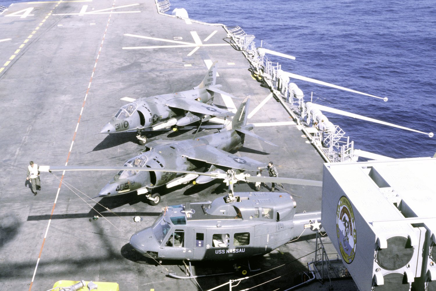 295k | Two McDonnell Douglas AV-8C Harrier aircraft and a Bell UH-1N Twin Huey helicopter parked on the flight deck of USS Nassau (LHA-4), 4 January 1982. The two Harriers were assigned to