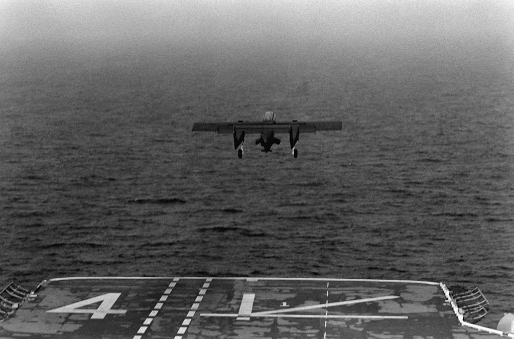 U.S. Marine Corps Observation Squadron (VMO-1) on the port elevator of the ship in 1983. After its retirement this aircraft