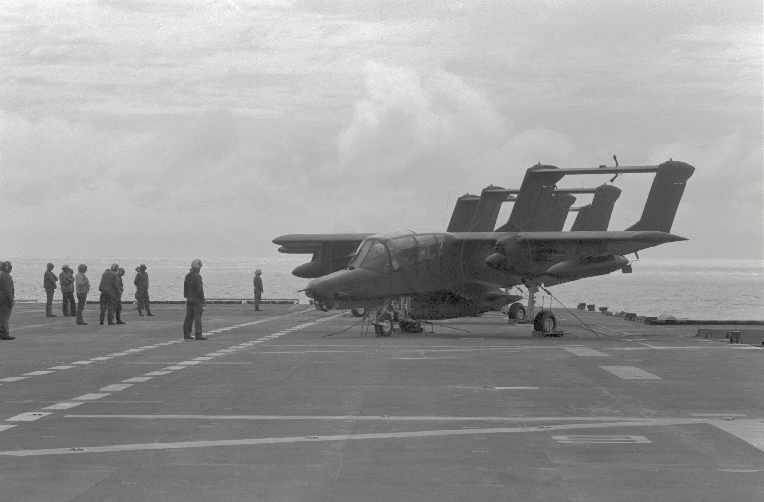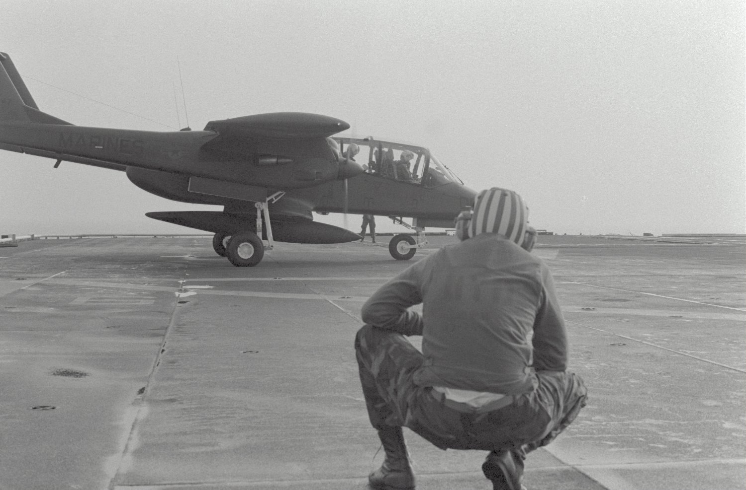 222k | A flight deck crewman stands by as a North American Rockwell OV-10A Bronco of