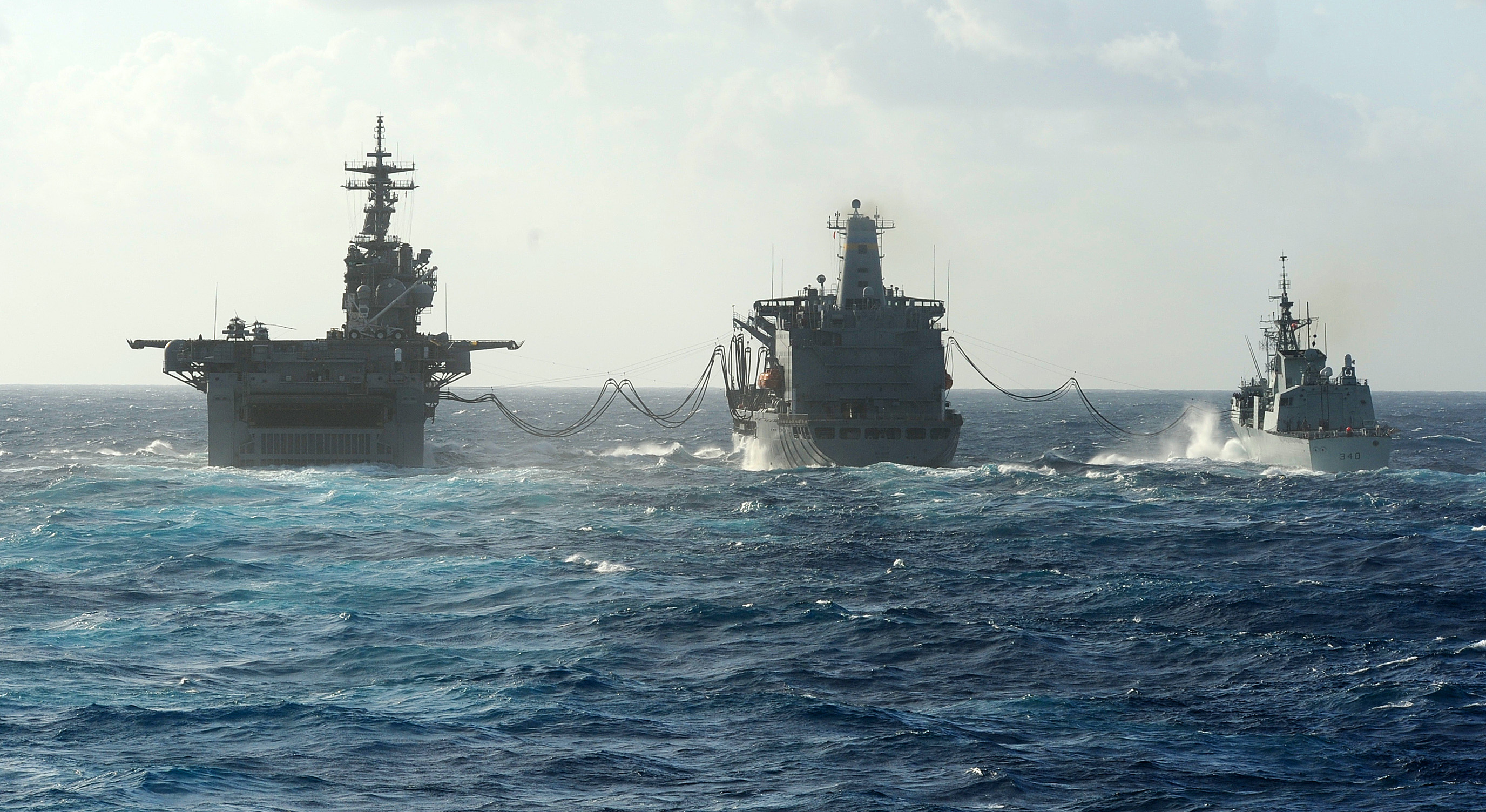 1216k | USS Wasp (LHD-1), left, the Military Sealift Command fleet replenishment oiler USNS Big Horn (T-AO 198) and the Royal Canadian navy frigate HMCS St. John's (FFH-340) perform a replenishment at sea while transiting the Gulf of Mexico. Wasp is underway to participate in the upcoming Fleet Week events in New Orleans, La., and Port Everglades, Fla. US Navy photo # 120416-N-AW702-021 GULF OF MEXICO (April 16, 2012) by MC2 Jacob Sippel. |