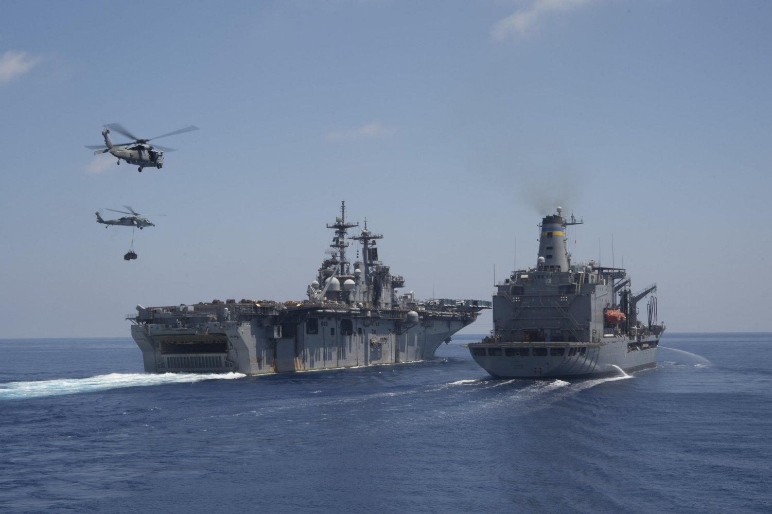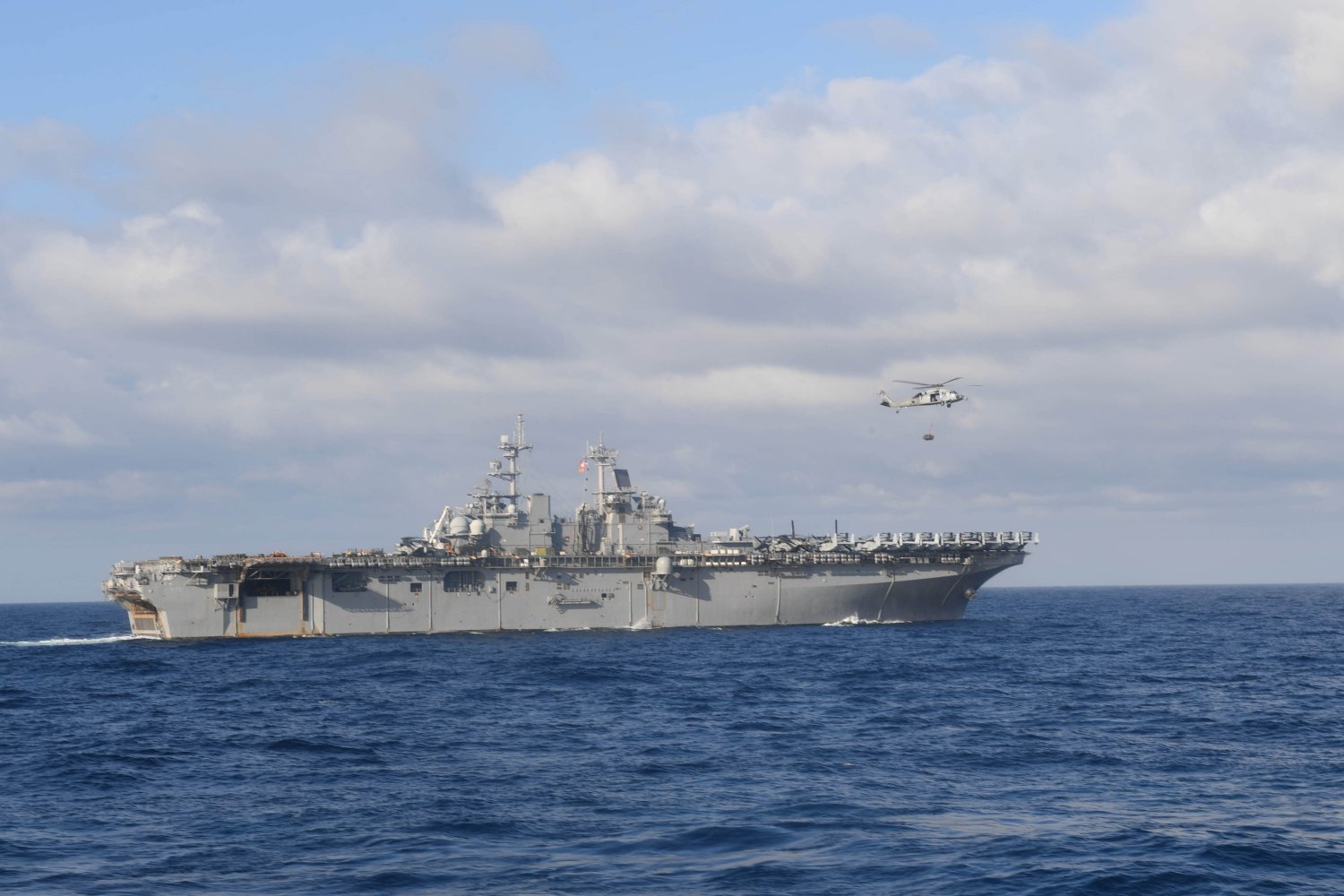 178k | An MH-60S Sea Hawk helicopter departs USS Wasp (LHD-1) during a vertical replenishment with the Military Sealift Command