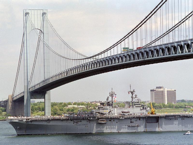 79k | USS Wasp (LHD-1) making her way up river beneath the Verrazzano-Narrows Bridge, 26 May 1999. The ship was participating in New York City's Fleet Week '99'. U.S. Navy photo # 990526-N-7230N-001 |