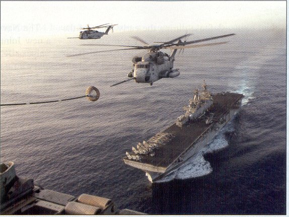 72k | Flying over USS Wasp (LHD-l) in the Arabian Sea, June 2002, two CH-53E Sea Stallions prepare to refuel from