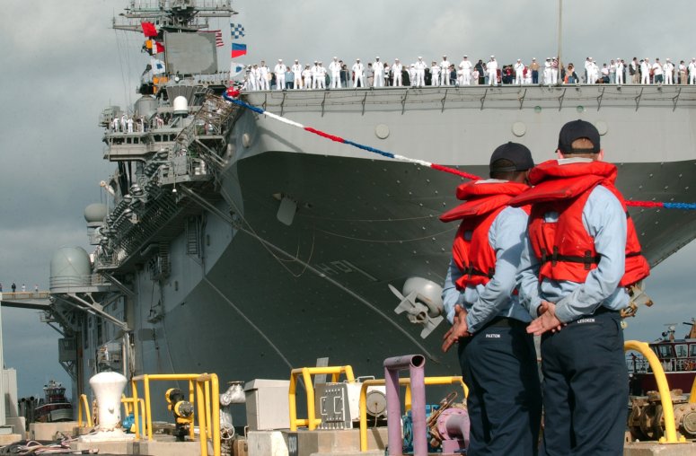 87k | USS Wasp (LHD-1) pulls into Naval Station Norfolk, 18 September 2004, as line handlers assigned to USS Kearsarge (LHD 3), stand at parade rest ready to secure the ship to the pier. Wasp returned to Norfolk following a seven-month deployment in support of Operation Enduring Freedom (OEF) and Operation Iraqi Freedom (OIF). US Navy photo # 040918-N-6371Q-036 by PHAN Orlando Quintero. |