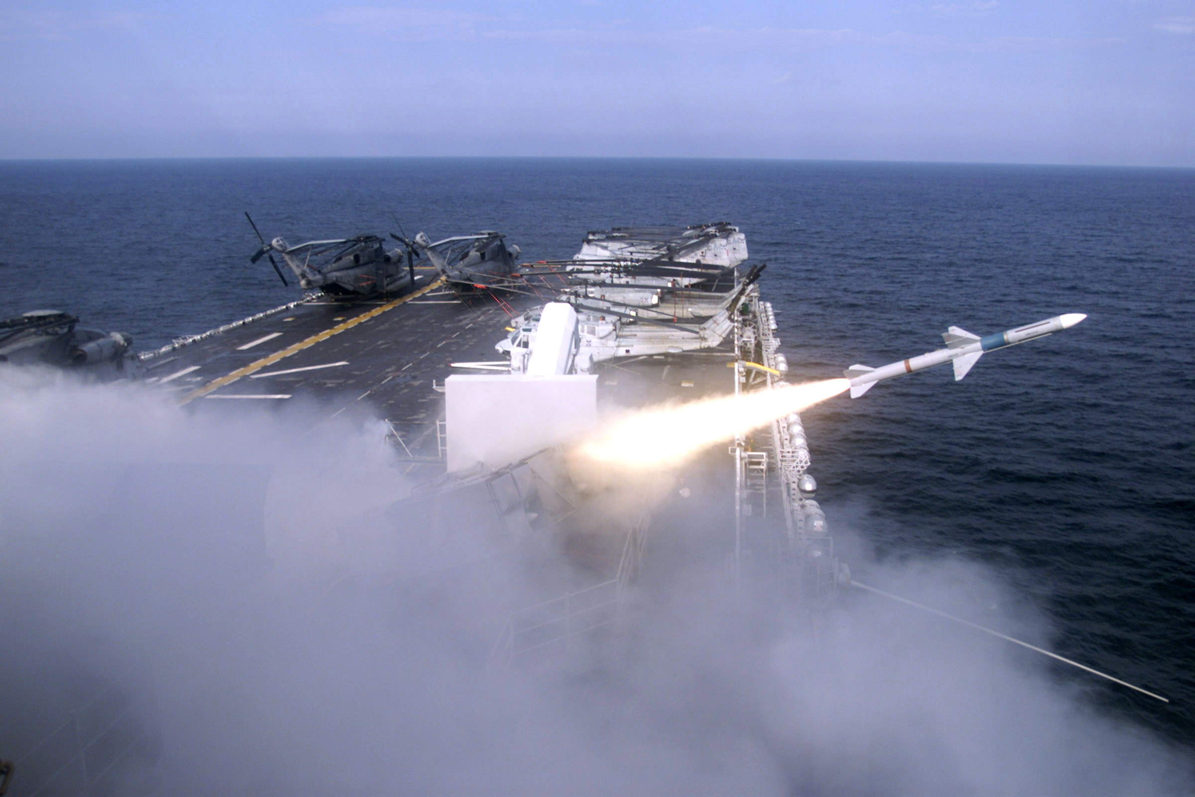 372k | USS Wasp (LHD-1) launches a single RIM-7M "Sea Sparrow" from her forward missile mount, 17 January 2002. The RIM-7M is used aboard ships for surface-to-air anti-missile defense. Wasp is conducting a Joint Task Force/Special Operations Capabilities (SOCEX) Exercise while preparing for her scheduled six-month deployment. US Navy photo # 020117-N-2210L-001 At sea aboard USS Wasp (LHD 1) Jan. 17, 2002 by PHAN Aaron W. Lockhart. |