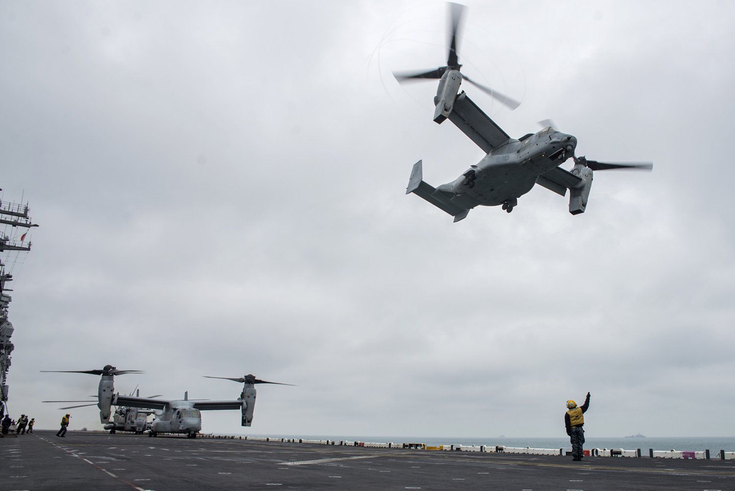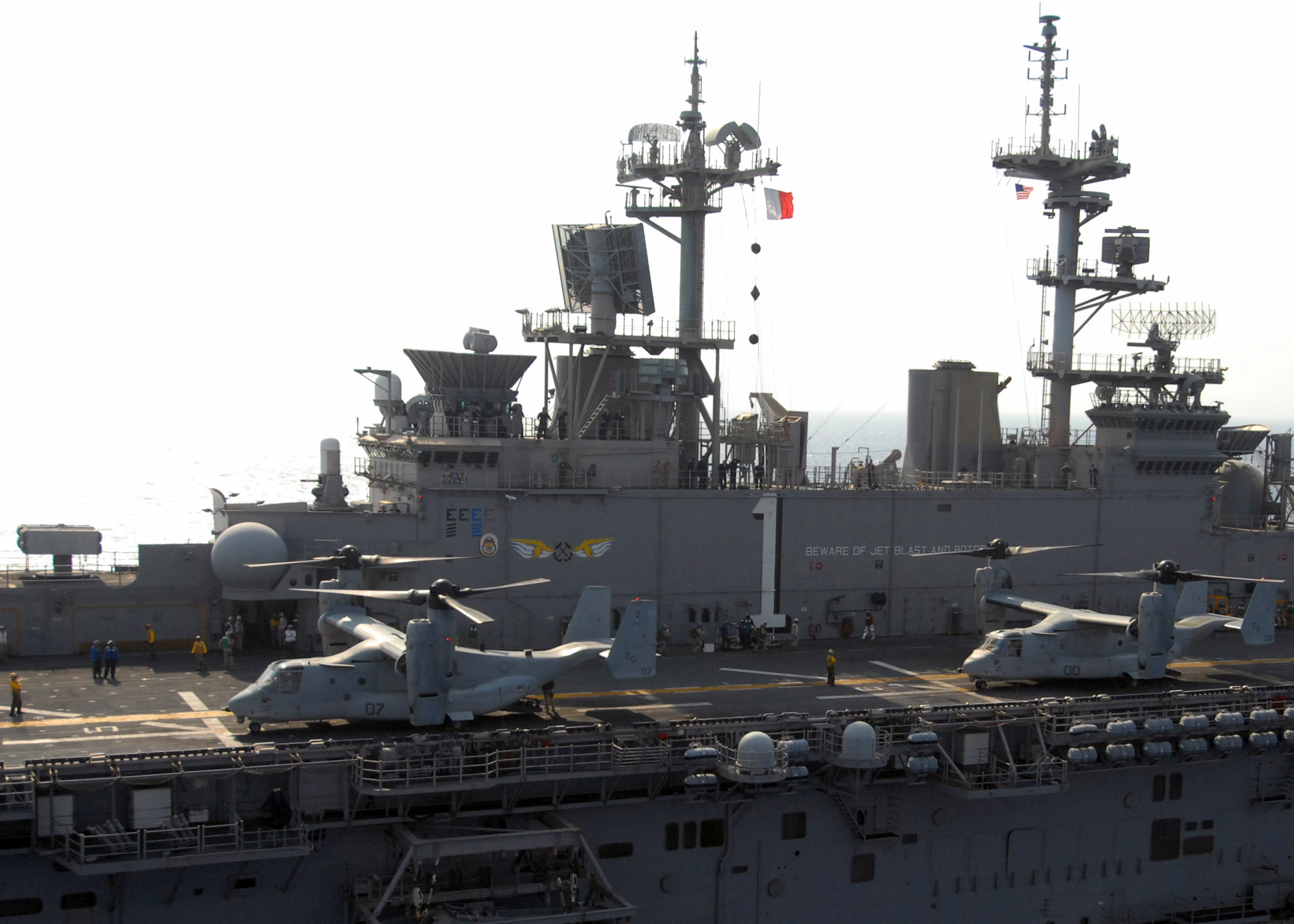 495k | U.S. Marine Corps MV-22 Ospreys, assigned to Marine Medium Tiltrotor Squadron (VMM-263), Marine Aircraft Group 29, preparing for lift off from the flight deck of USS Wasp (LHD-1). Wasp is on surge deployment to the Middle East carrying the Osprey to its first combat deployment. US Navy photo # 071004-N-1189B-022 GULF OF AQABA (Oct. 4, 2007) by MC2 Zachary L. Borden. |