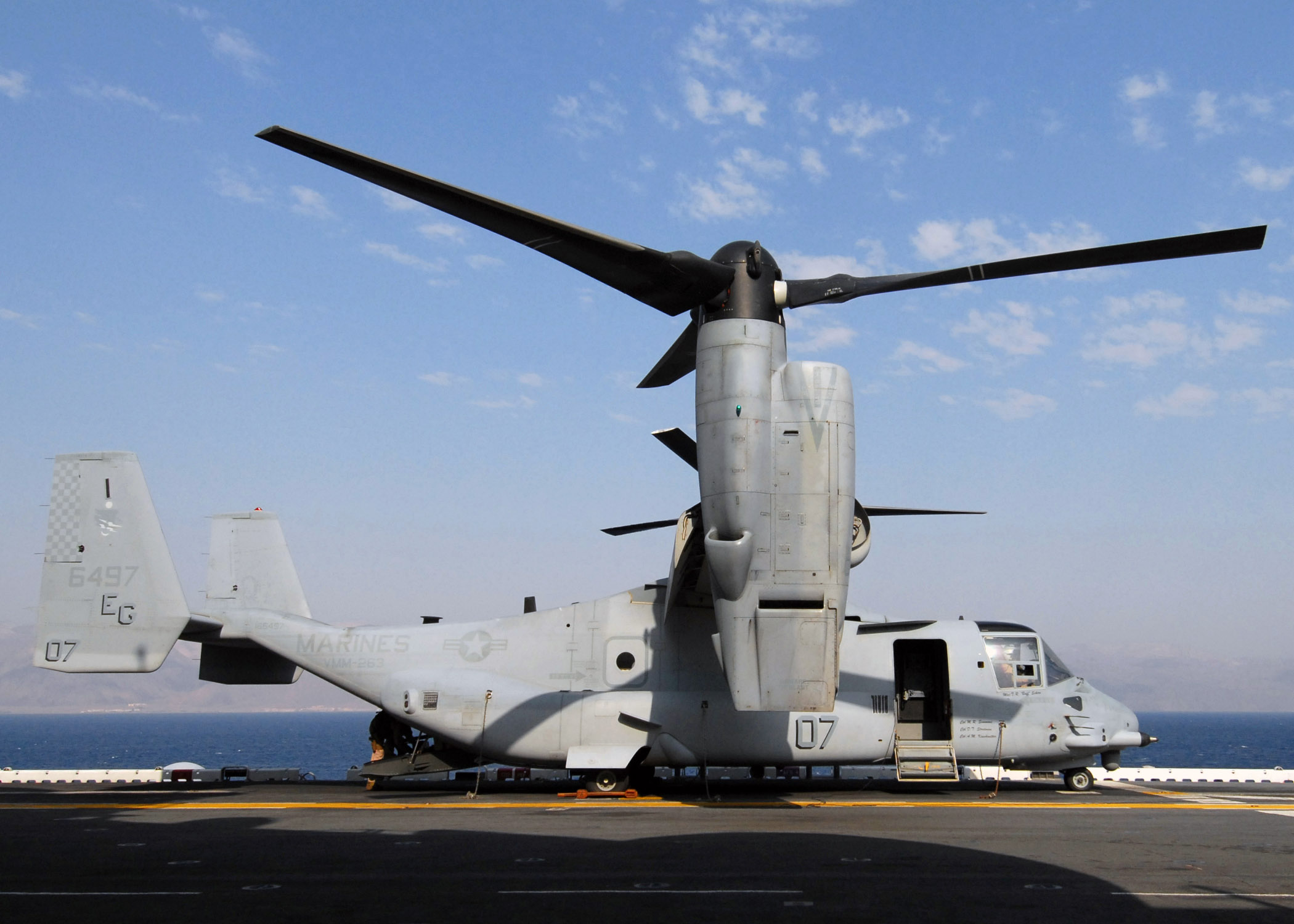408k | U.S. Marine Corps MV-22 Ospreys, assigned to Marine Medium Tiltrotor Squadron (VMM-263), Marine Aircraft Group 29, preparing for lift off from the flight deck of USS Wasp (LHD-1). Wasp is on surge deployment to the Middle East carrying the Osprey to its first combat deployment. US Navy photo # 071004-N-1189B-048 GULF OF AQABA (Oct. 4, 2007) by MC2 Zachary L. Borden. |