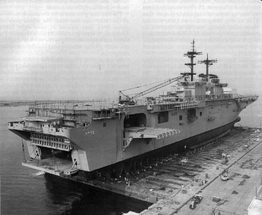128k | Wasp (LHD-1) on the Ingalls transporter at Pascagoula prior to launch, 30 July 1987. Ingalls Shipbuilding Corp. photo from "U.S. Amphibious Ships and Craft: An Illustrated Design History" by Norman Friedman. |