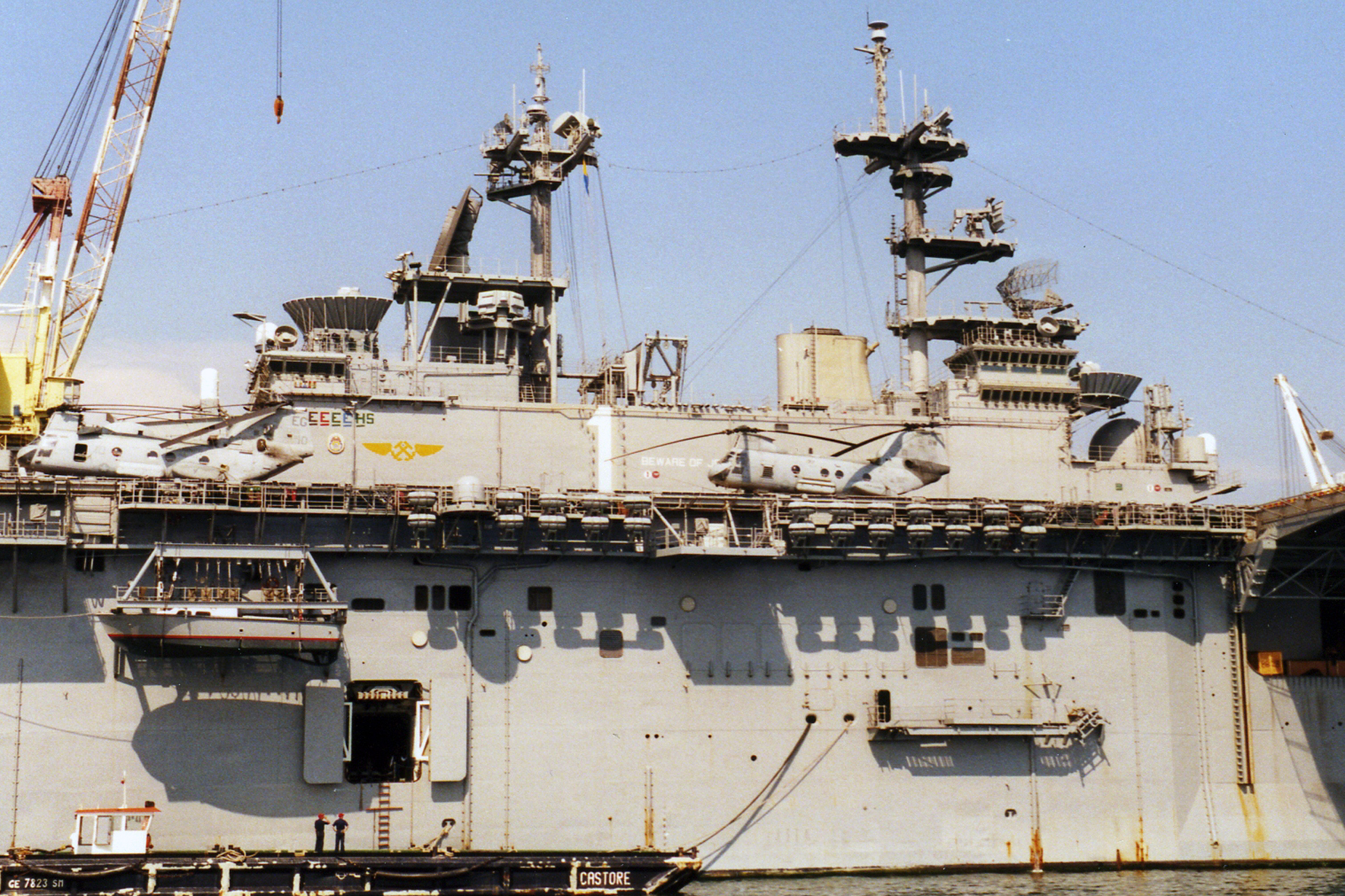 78k | USS Wasp (LHD-1) drydocked, at Ingalls Shipbuilding Corp, Pascagoula, MS. after launching, circa August 1987. US Navy photo from "All Hands" magazine, August 1989, Courtesy Ingalls Shipbuilding Corp. |