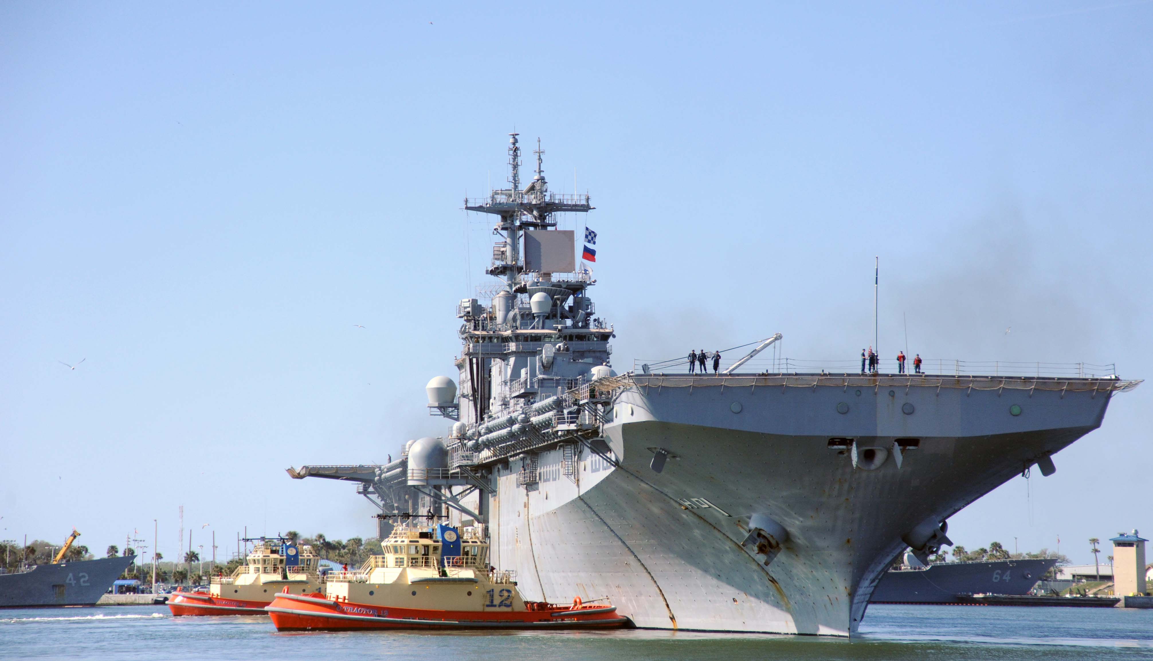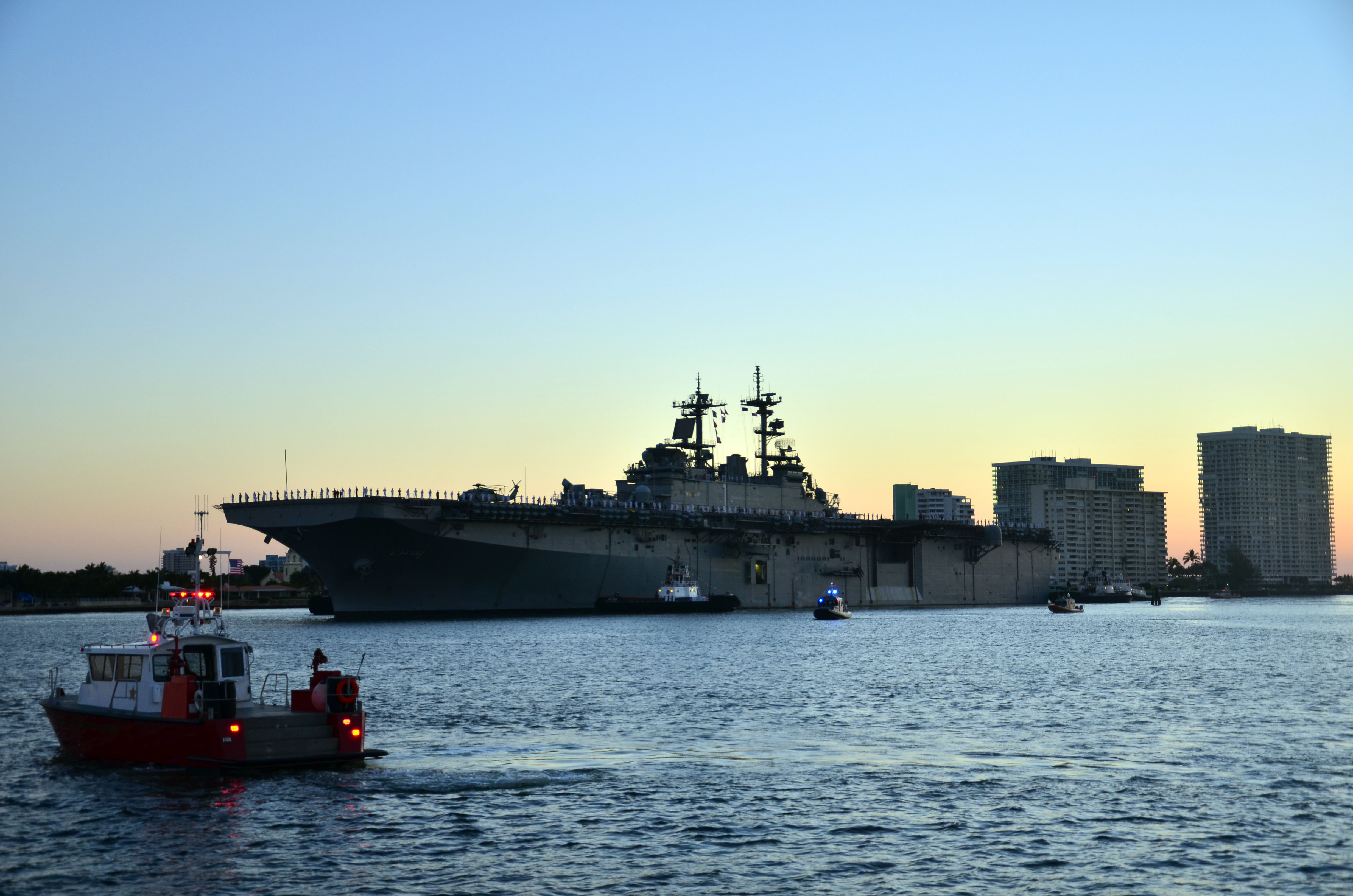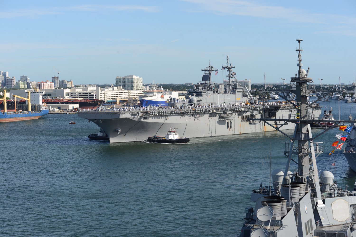 1416k | USS Wasp (LHD-1) prepares to moor at Port Everglades. Wasp, along with four other U.S. Navy ships and