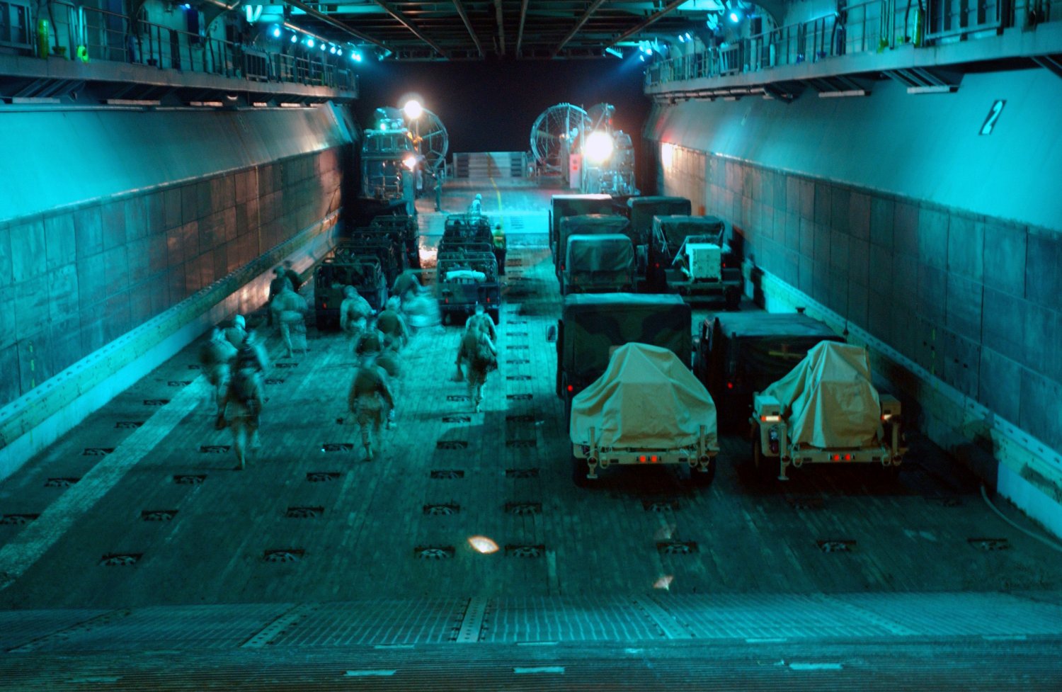 248k | US Marines assigned to the 22nd Marine Expeditionary Unit (Special Operations Capable) load onto an Landing Craft Air Cushion (LCAC) assigned to Assault Craft Unit Four (ACU-4), Northern Arabian Gulf, 24 March 2004. The Marines are conducting offload operations aboard the amphibious assault ship USS Wasp (LHD-1). Wasp and her embarked 22nd Marine Expeditionary Unit (Special Operations Capable) are currently on deployment in the 5th Fleet Area of Responsibility (AOR) as the lead ship for Expeditionary Strike Group Two (ESG 2). US Navy photo # 040324-N-7586B-078 by PH1 Bart Bauer. |