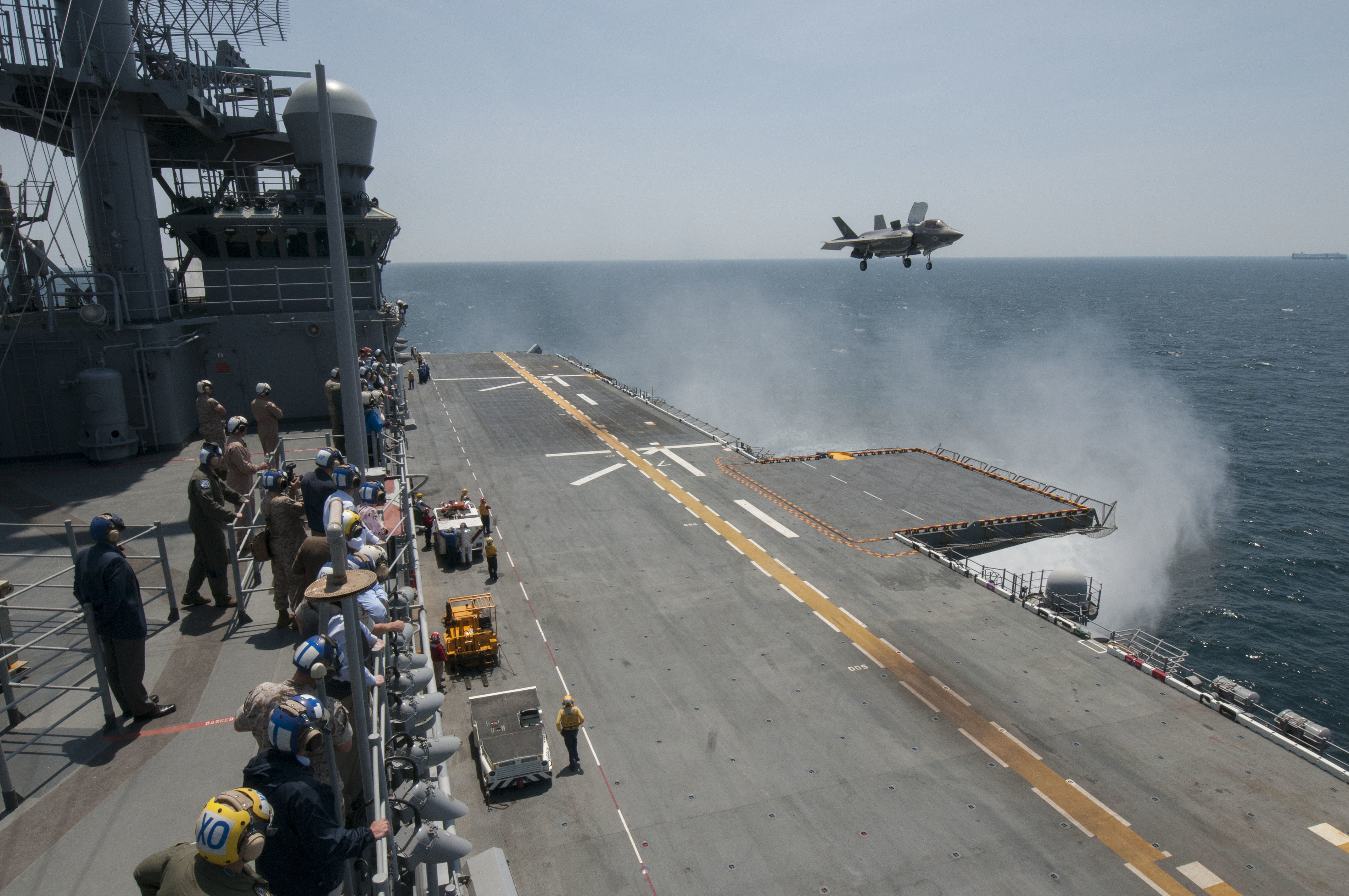 1991k | Sailors and distinguished visitors watch an F-35B Lightning II aircraft conduct vertical takeoff and landing flight operations