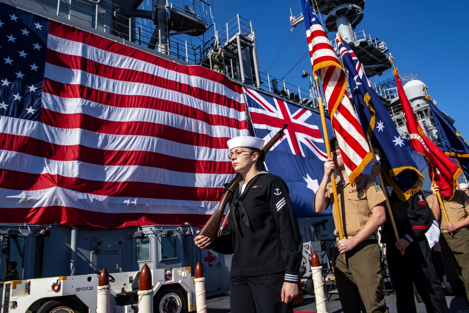 330k | A color guard parades the U.S. and Australian colors during the closing ceremony of exercise Talisman Sabre 2019 aboard USS Wasp