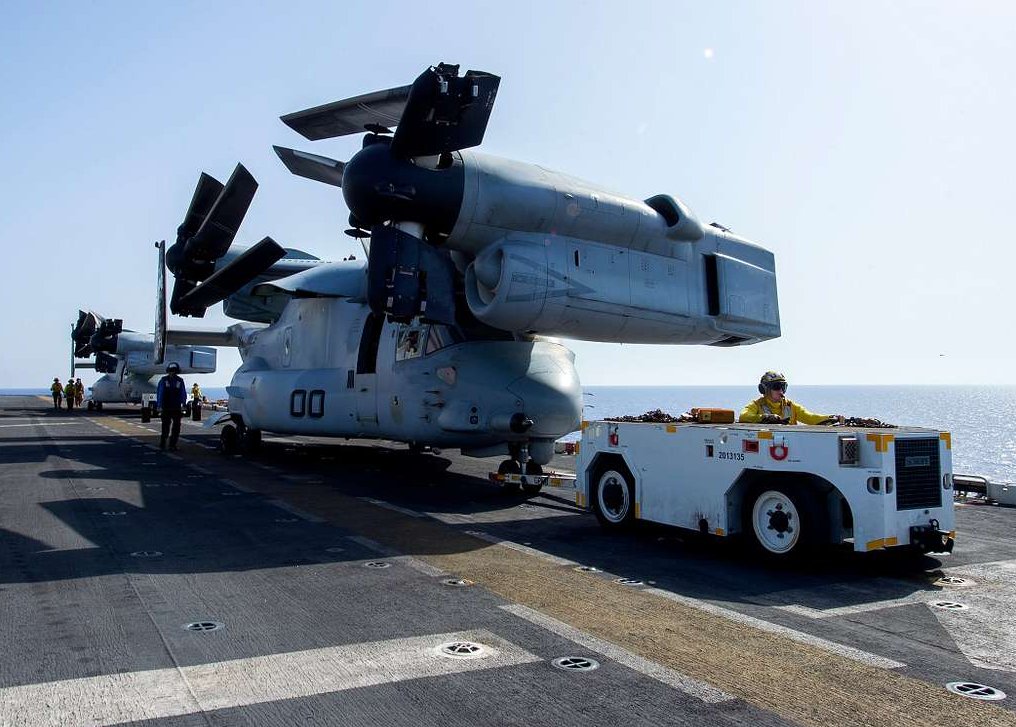 141k | Sailors maneuver an MV-22B Osprey across the flight deck of USS Wasp (LHD-1), 4 October 2016. Wasp is deployed with the Wasp