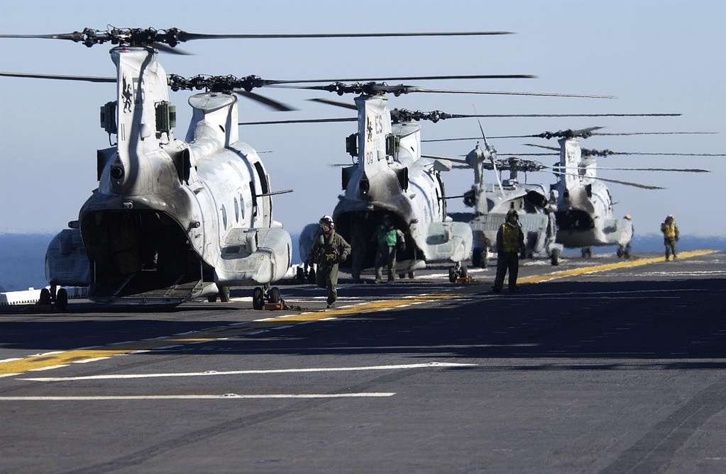 104k | Three CH-46 Sea Knight helicopters prepare to launch from the flight deck USS Wasp (LHD-1) to go on their next assigned mission