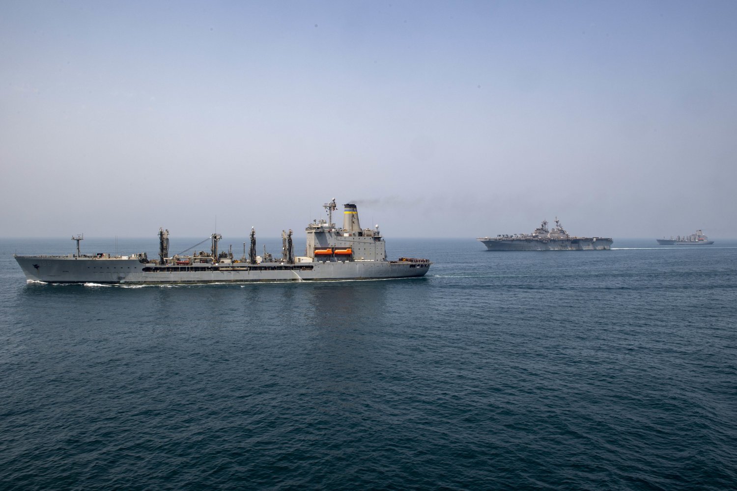 USS Boxer (LHD-4), and USNS Tippecanoe (T-AO-199) transit the Arabian Gulf. Boxer is part of the Boxer Amphibious