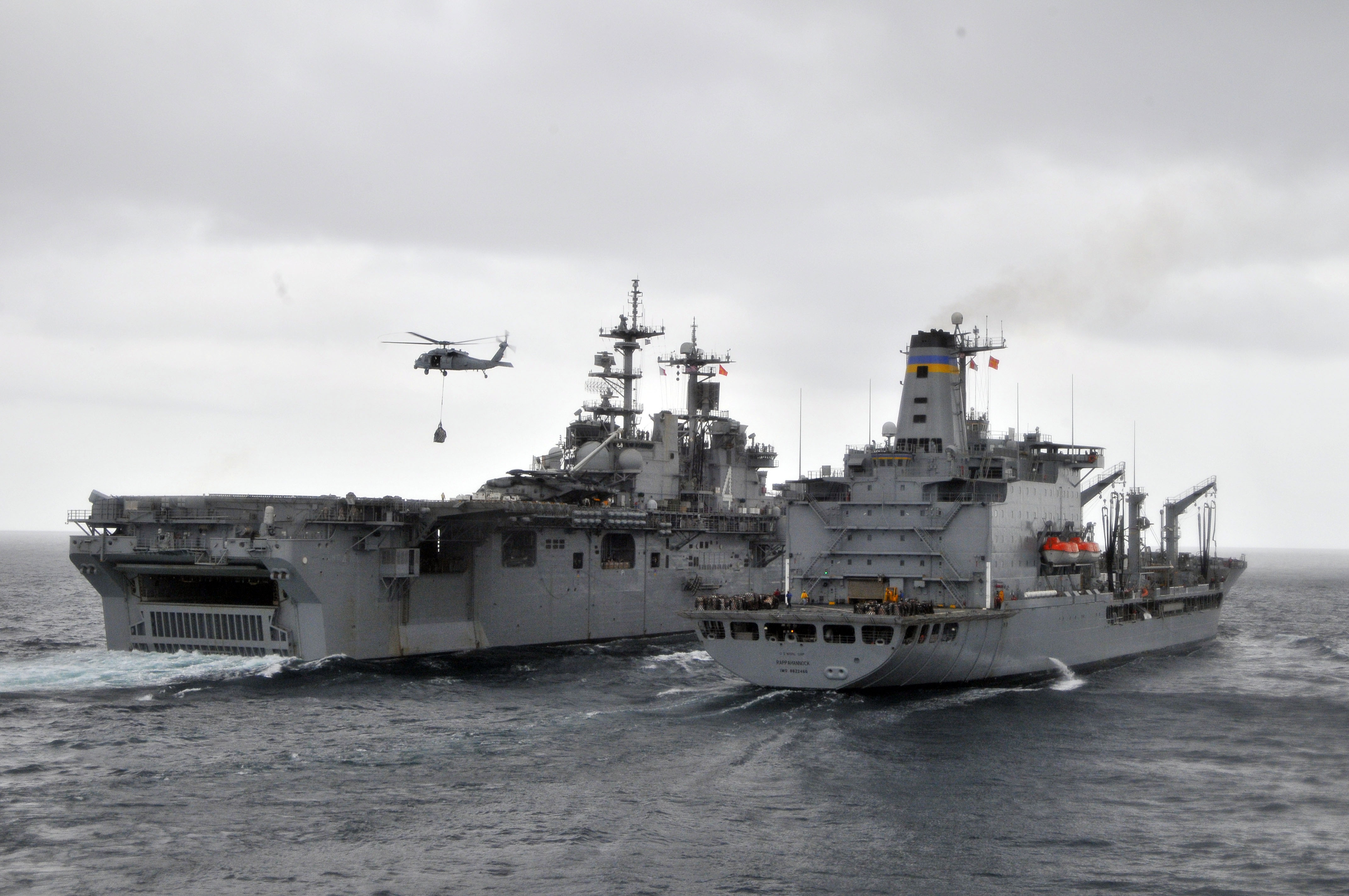 148k | USS Boxer (LHD-4), background receives a vertical replenishment-at-sea from the fast combat support ship