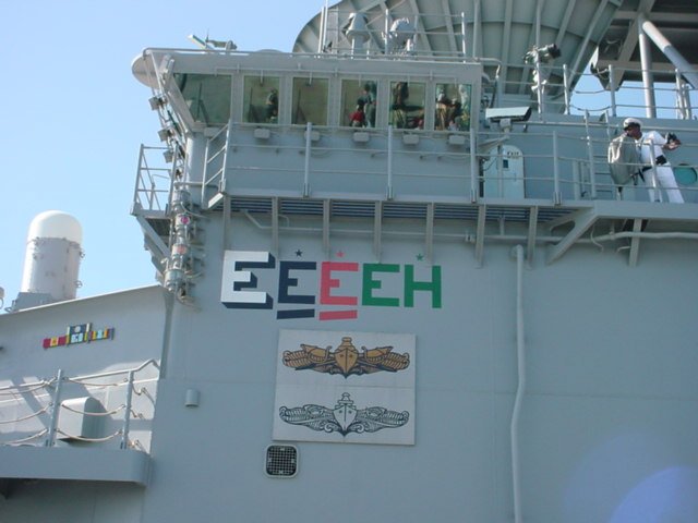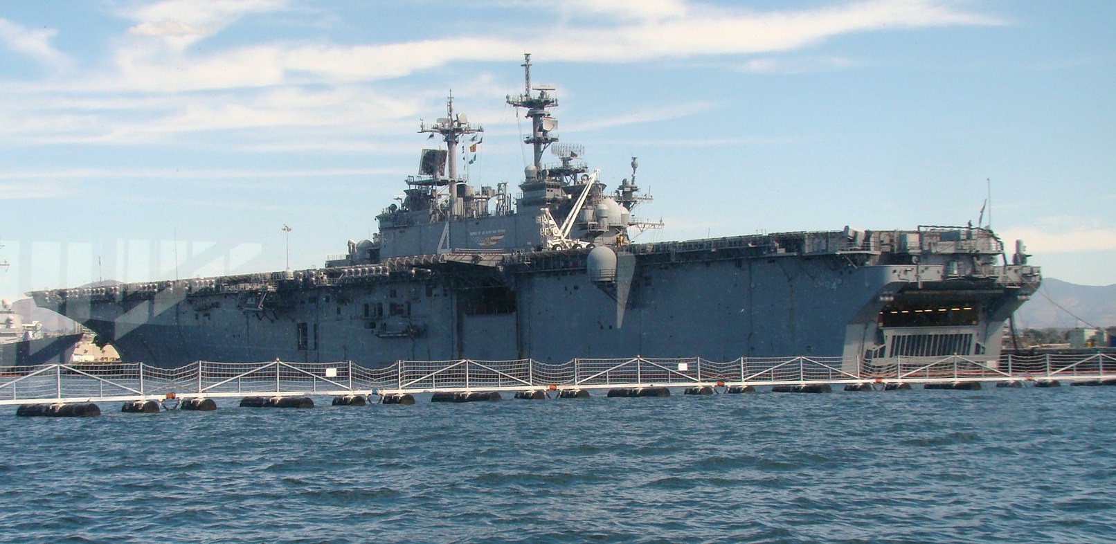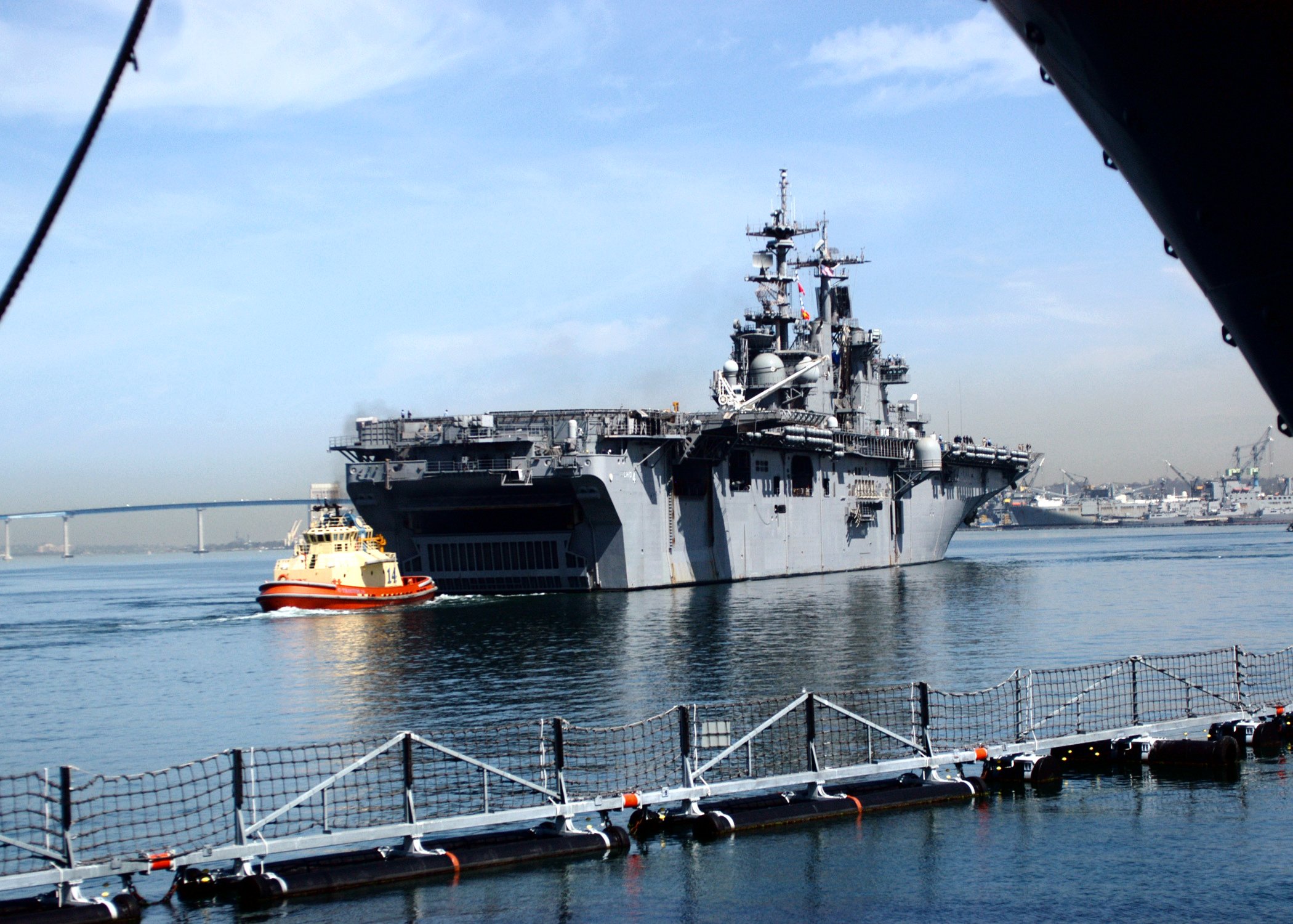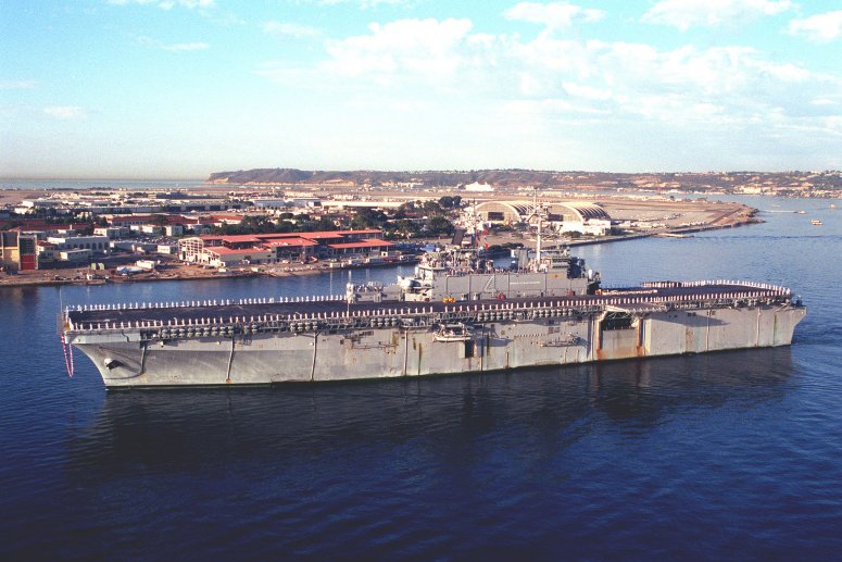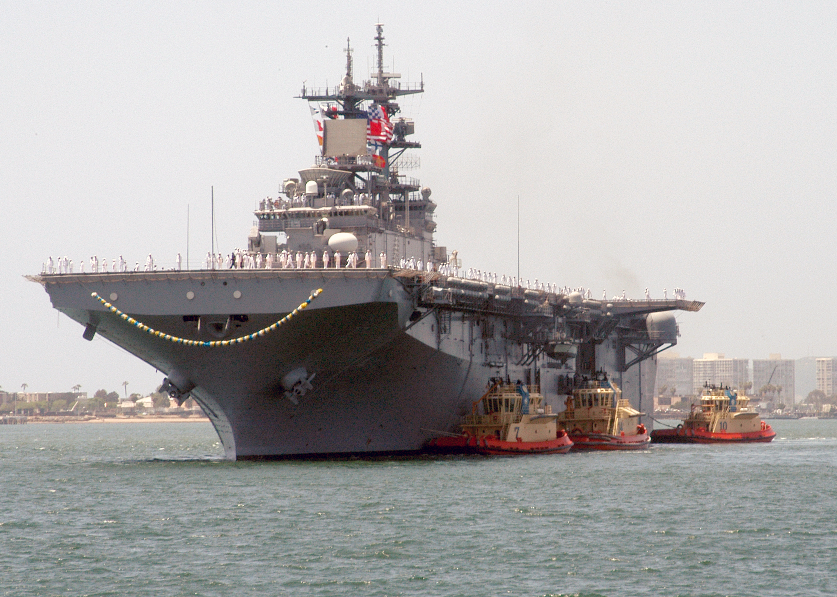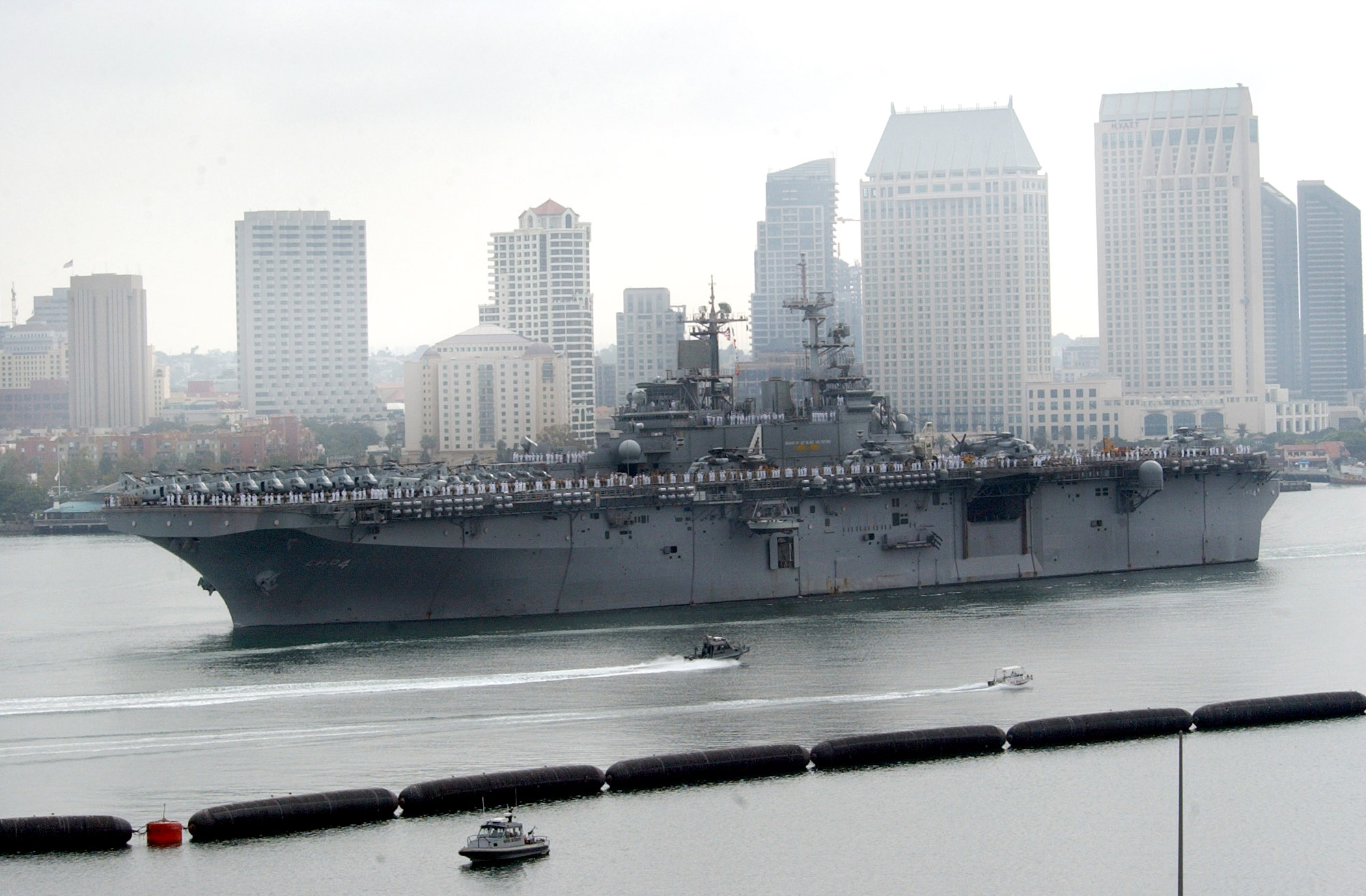 1993k | USS Boxer (LHD-4) steams in San Diego Harbor on her way to her berth at Naval Station San Diego with her Sailors "manning the rails." Boxer is part of the seven-ship Amphibious Task Force West (ATF-W), returning home after supporting U.S. and coalition forces during Operation Iraqi Freedom US Navy photo # 030726-N-0226M-004 San Diego, Calif. (July. 26, 2003) by PHCS Mahlon K. Miller. |