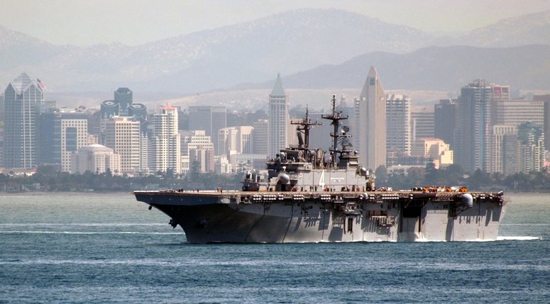 471k | USS Boxer (LHD-4) departing Naval Base San Diego on a scheduled Western Pacific deployment as part of Expeditionary Strike Group Five (ESG-5). The San Diego skyline is to starboard as she is outbound. ESG-5 is deploying in support of the global war on terrorism. US Navy photo # 060913-N-4776G-132 San Diego (Sept. 13, 2006) by MCSN Kathleen Gorby. |