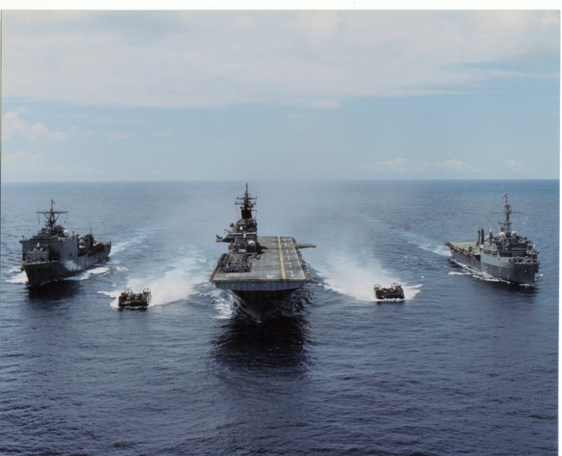 74k | Boxer (LHD-4) Amphibious Ready Group underway in 1997. From left to right USS Fort Fisher (LSD-40), USS Boxer (LHD-4) and USS Ogden (LPD-5). | Robert M. Cieri | |